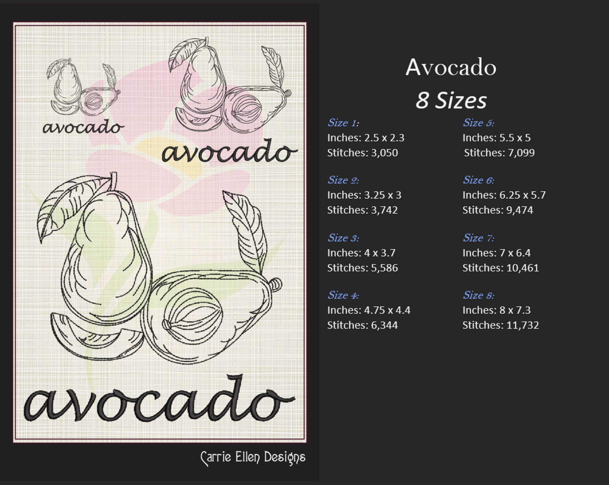 Available in 8 sizes, this embroidery pattern fits projects big and small. The simple yet bold design style makes it easy to match with a variety of themes, from farm-to-table aesthetics to fun, modern fruit patterns.