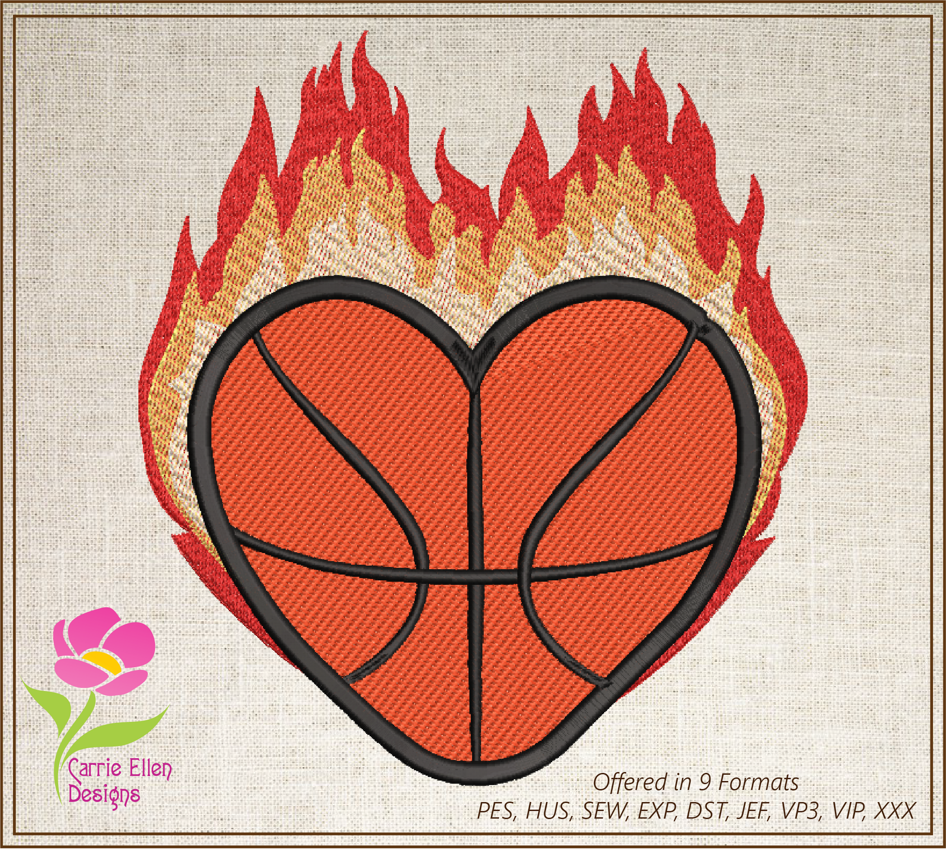 Basketball Machine Embroidery Design, Flaming Heart Basketball Embroidery, Sport Embroidery, Team Sport Design, 8 Sizes (0100)