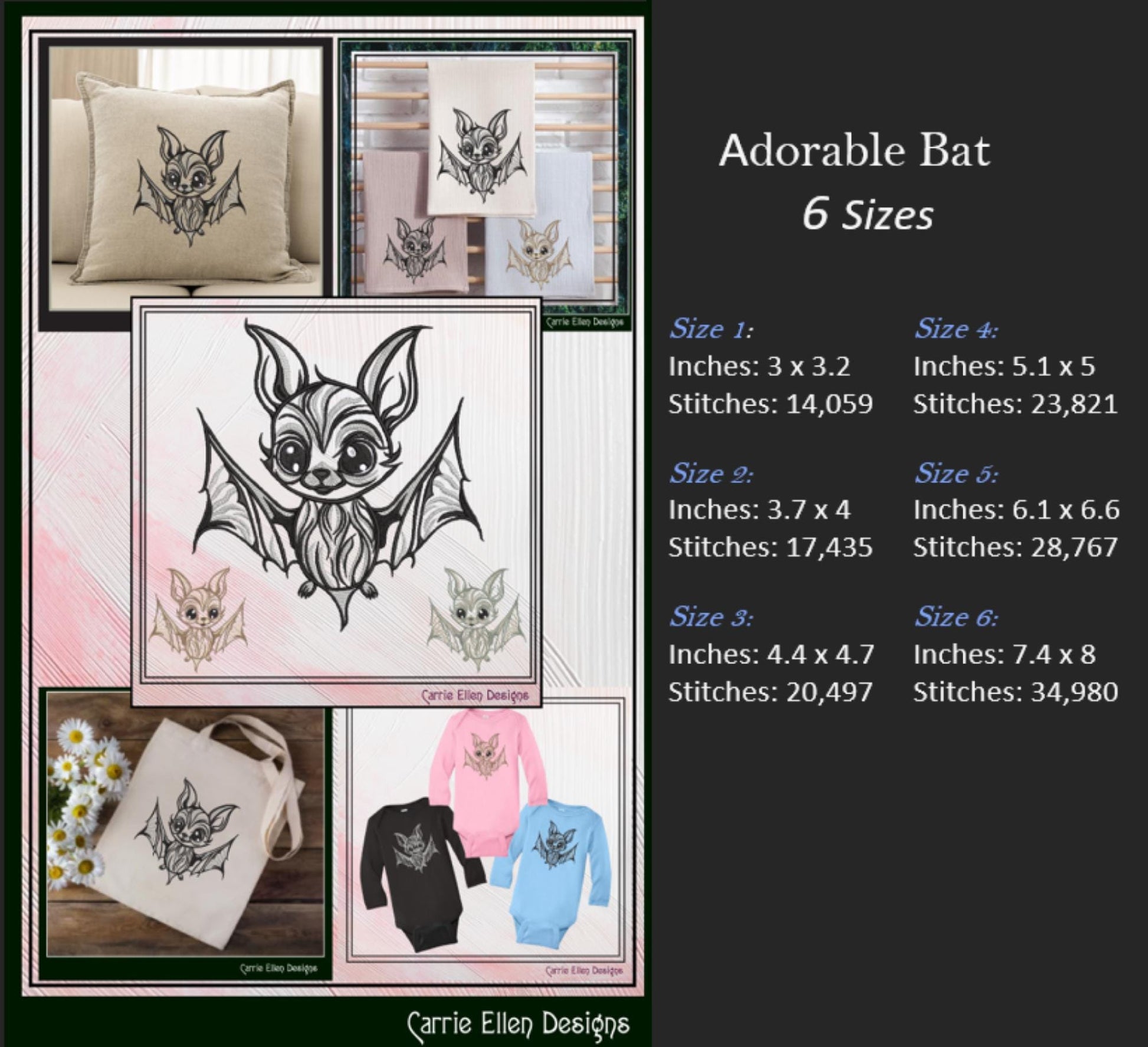 Add a playful touch to your embroidery projects with this cute bat design! Perfect for kids' apparel, Halloween-themed items, or fun accessories, this adorable flying bat pattern is sure to delight. Whether you're stitching on t-shirts, hats, or bags, this design brings a whimsical, spooky vibe to any creation.