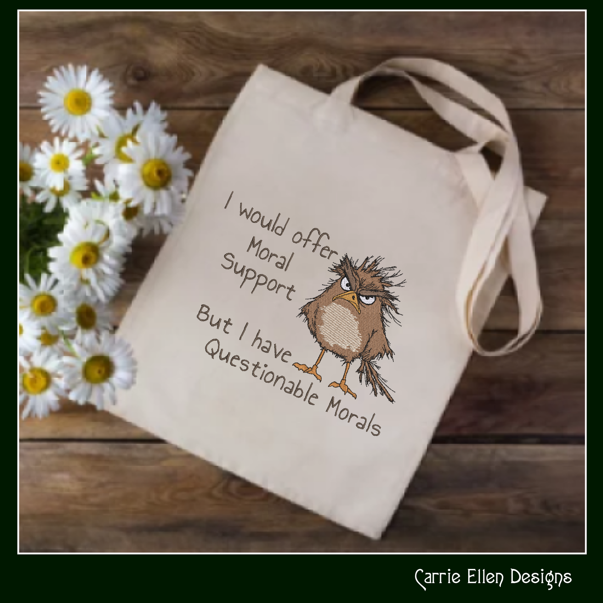 Add a touch of snarky humor to your embroidery projects with this “Questionable Morals” grumpy bird design. Featuring a sassy, sarcastic bird offering “moral support,” this design is perfect for those who love witty and cheeky humor. Whether for personalizing apparel, gifts, or home décor, this design brings a playful and rebellious spirit to any project.