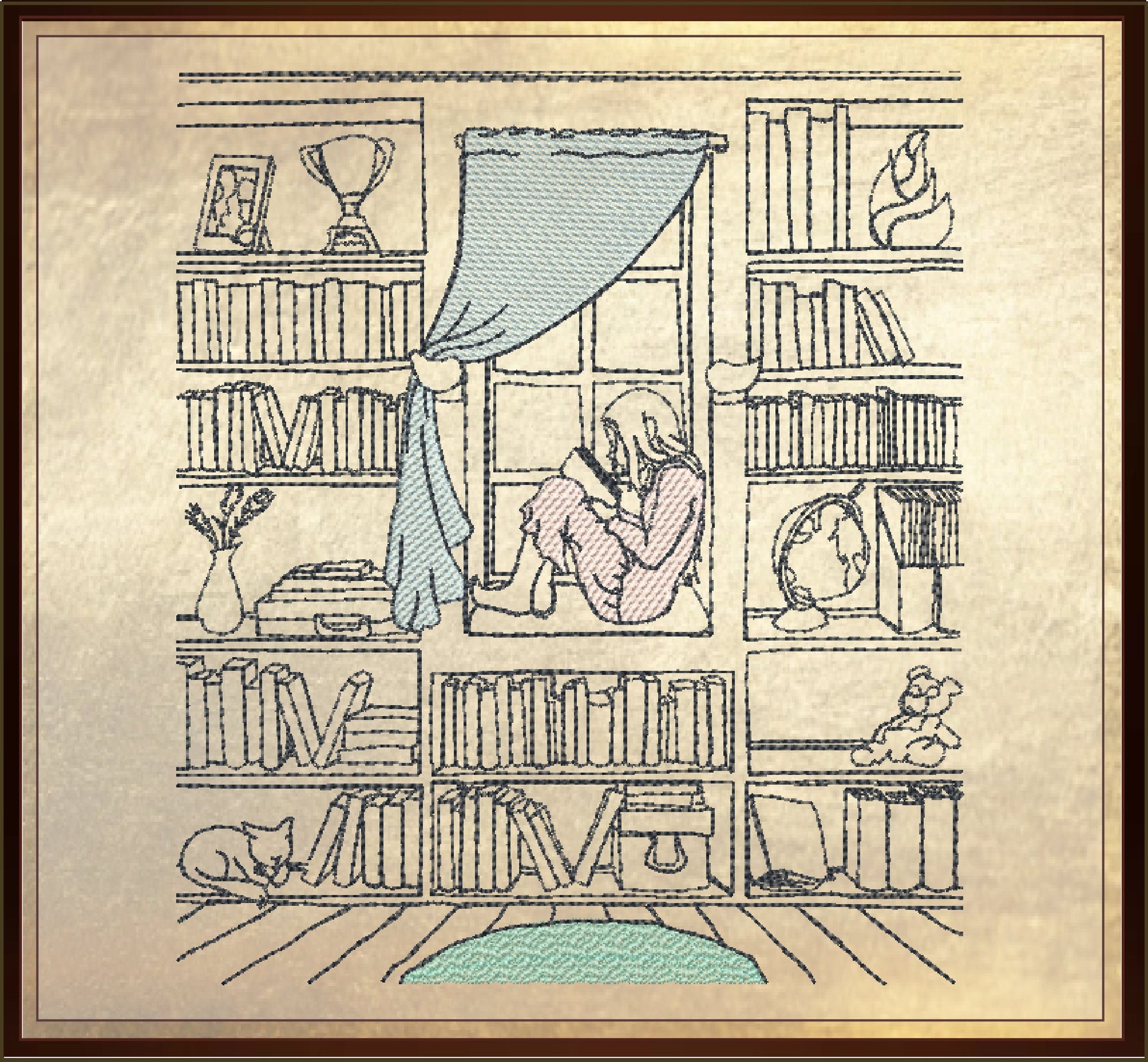 Book Nook Machine Embroidery Design | Girl in Window Reading Embroidery Drawing | Artistic Sketch Design | 8 Sizes (0923)