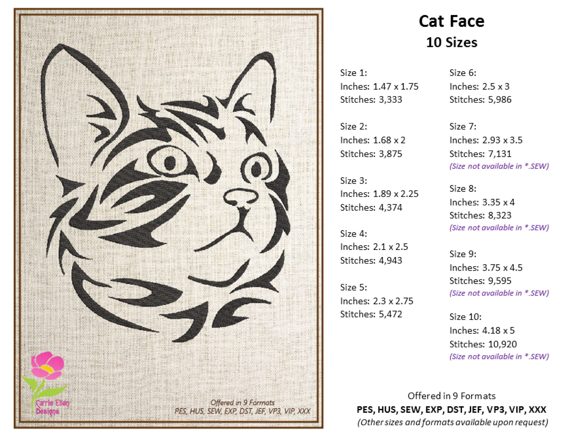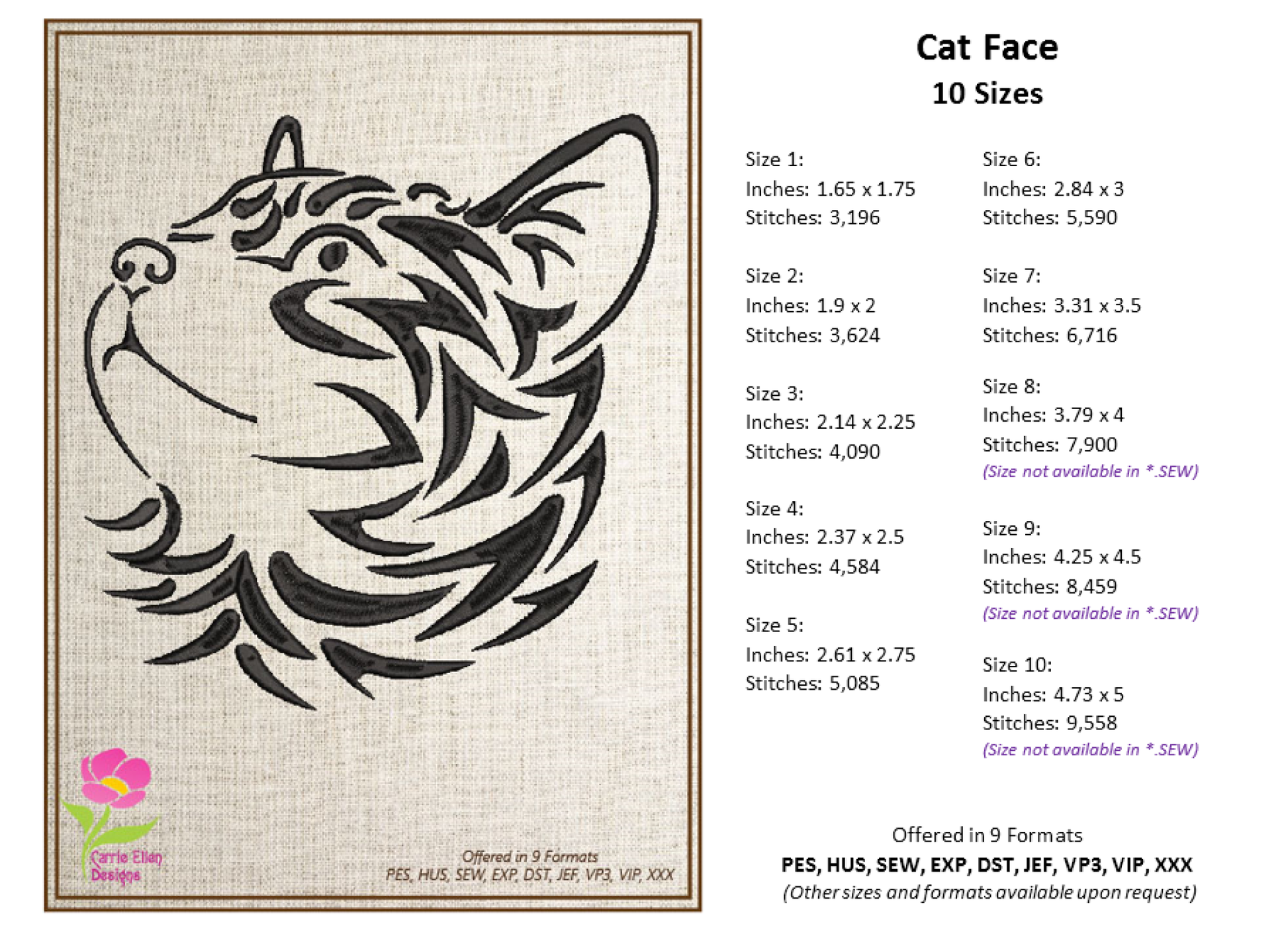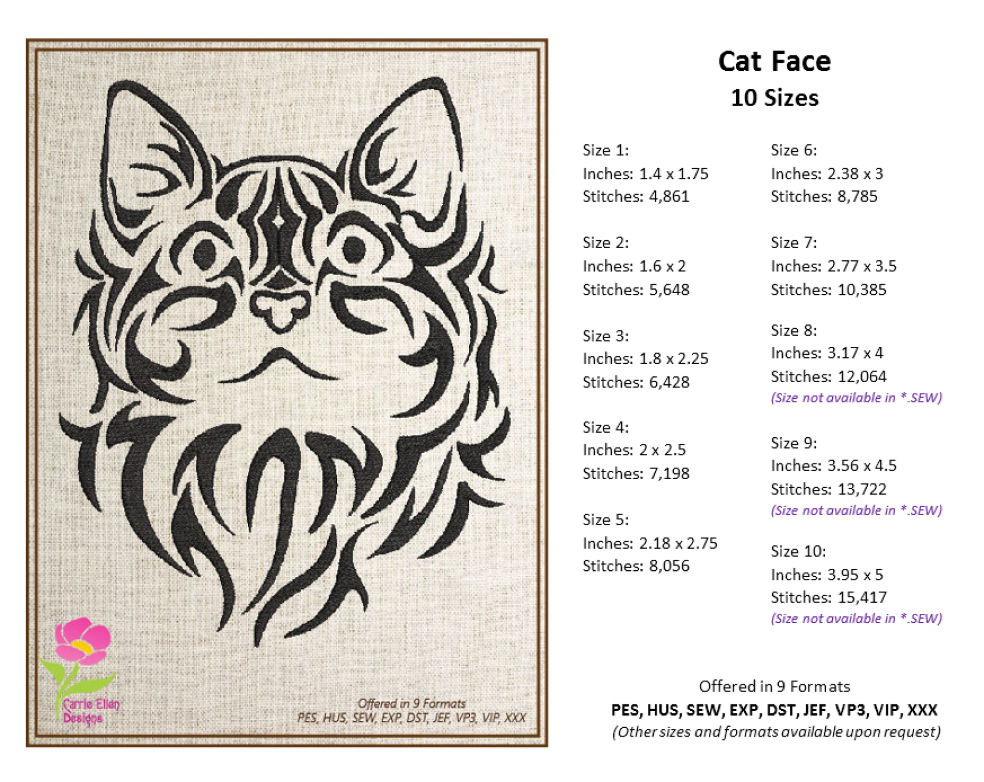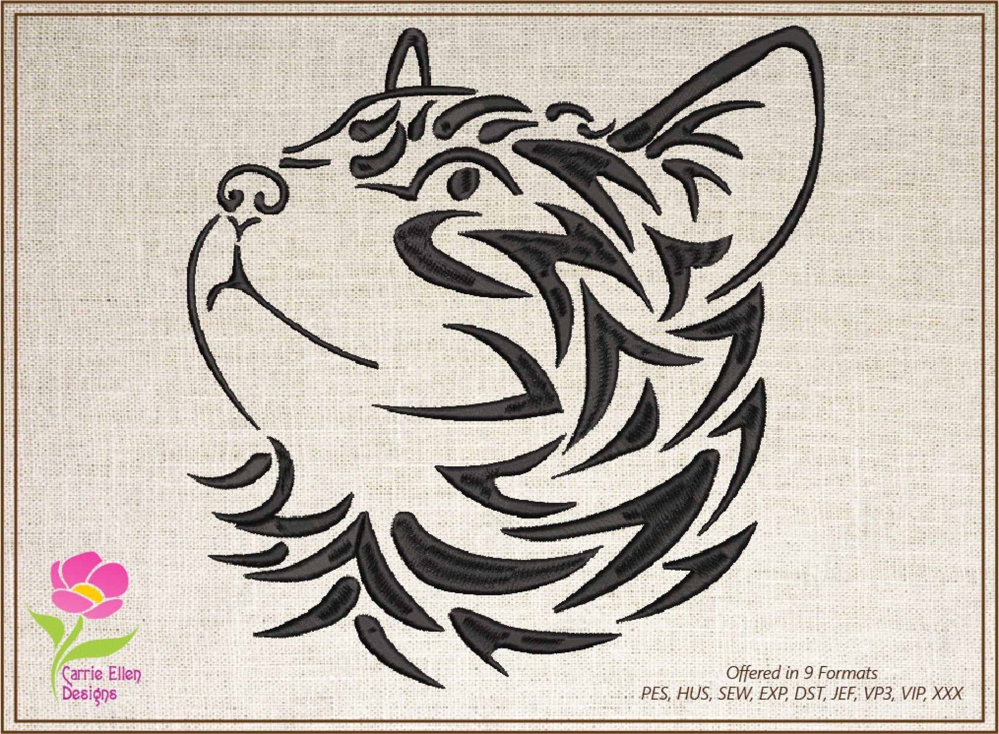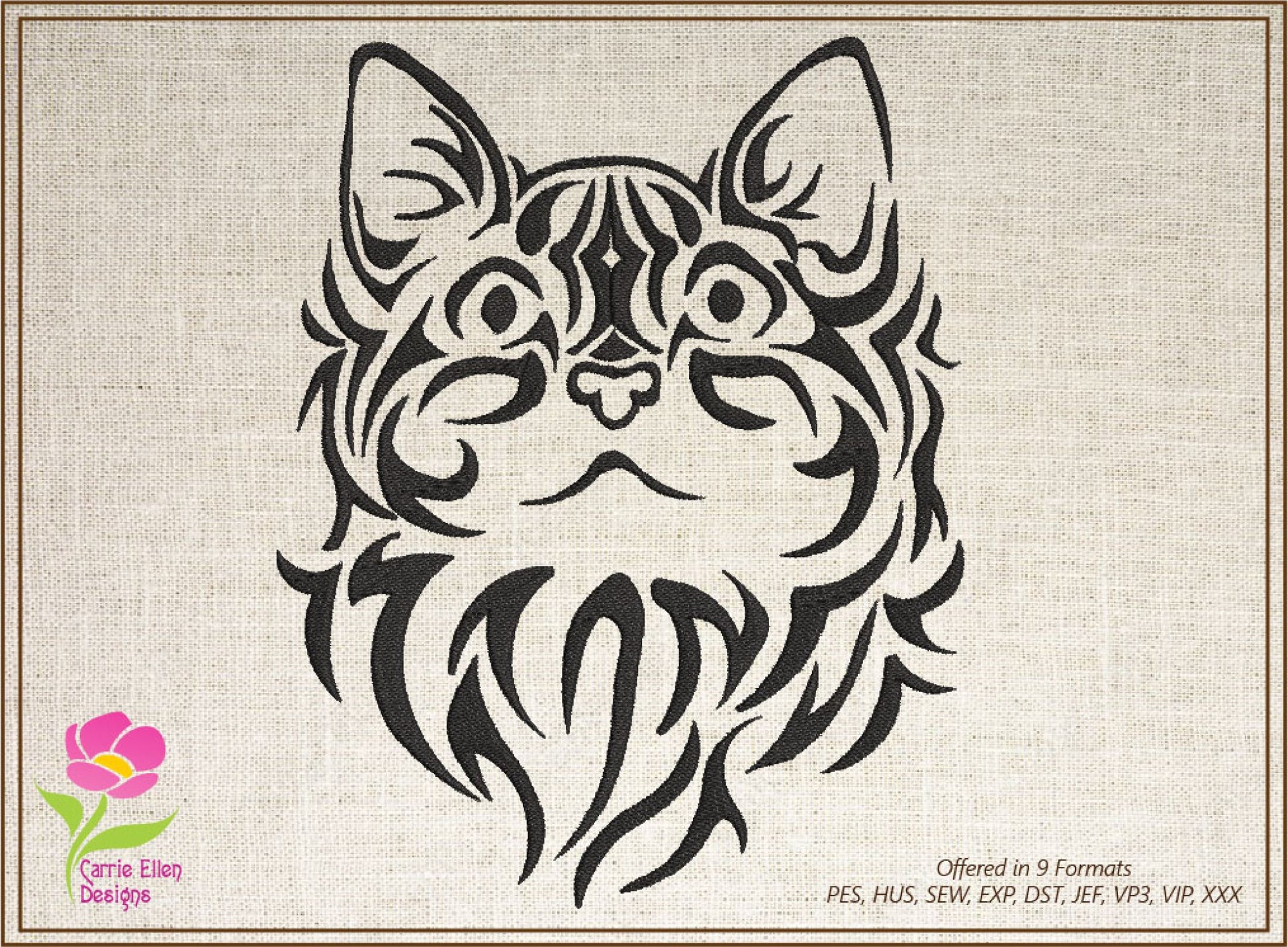 Cat Machine Embroidery Design Bundle – Tribal Cat Face Tattoo Style – 3 Designs, 10 Sizes Each (0295)