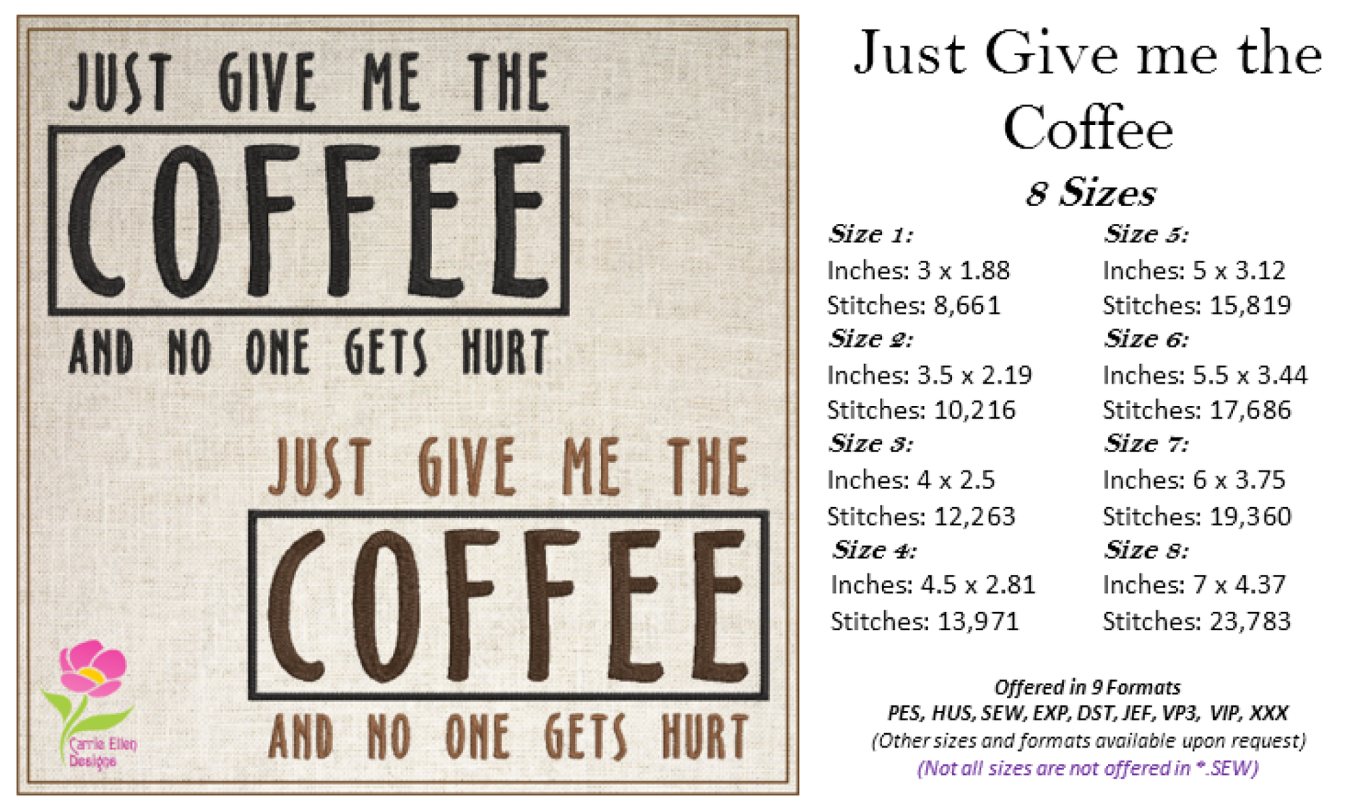 For all the coffee lovers out there who can’t start the day without their favorite brew! This Just Give Me The Coffee embroidery design is a must-have for any coffee enthusiast. Whether you're creating a personalized mug, a cozy throw pillow, or a quirky apron, this funny coffee quote will surely resonate with anyone who loves their caffeine fix.