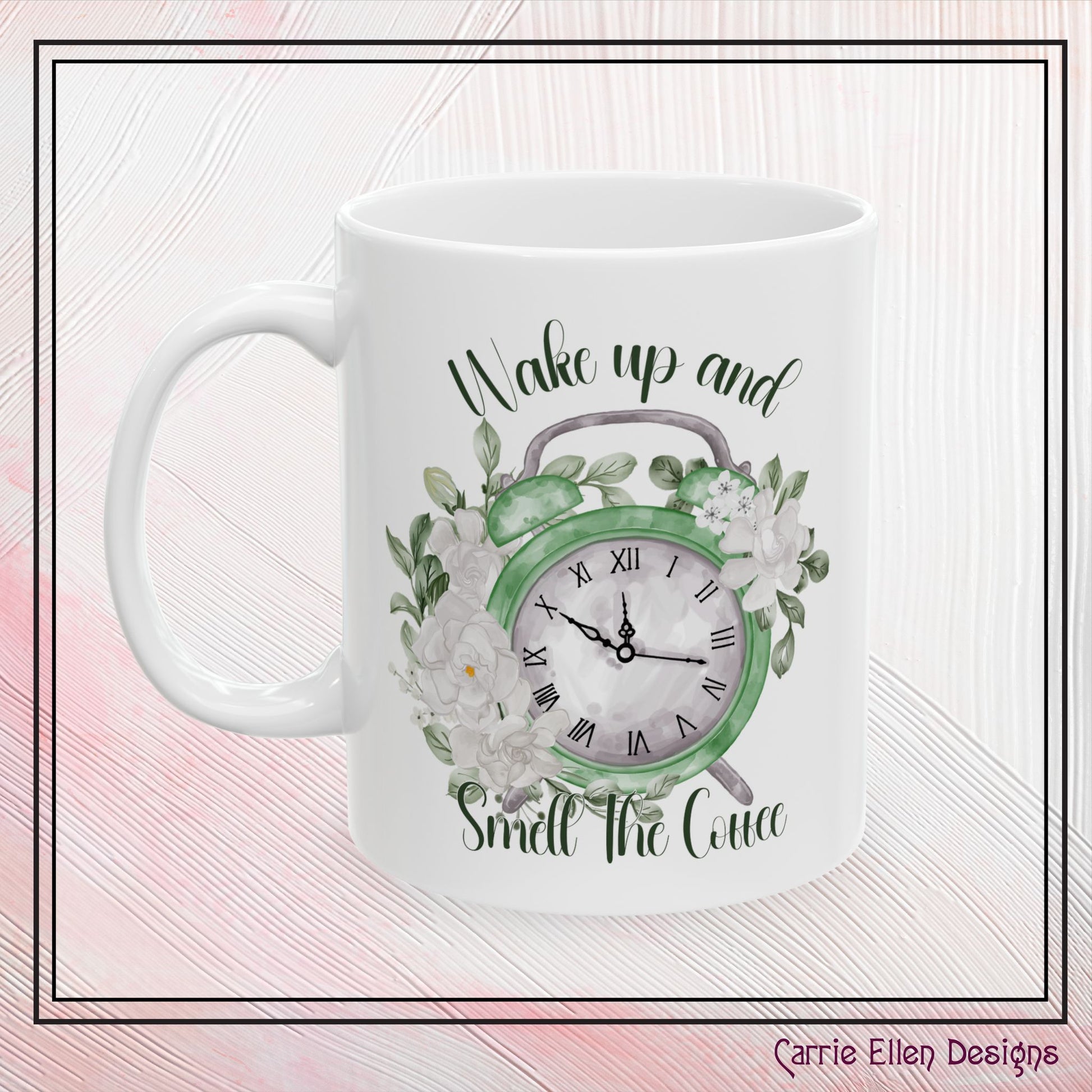 Wake Up and Smell The Coffee Floral Inspiration Ceramic Coffee Mug – 11oz & 15oz – Perfect Gift for Coffee Lovers (P-6003)