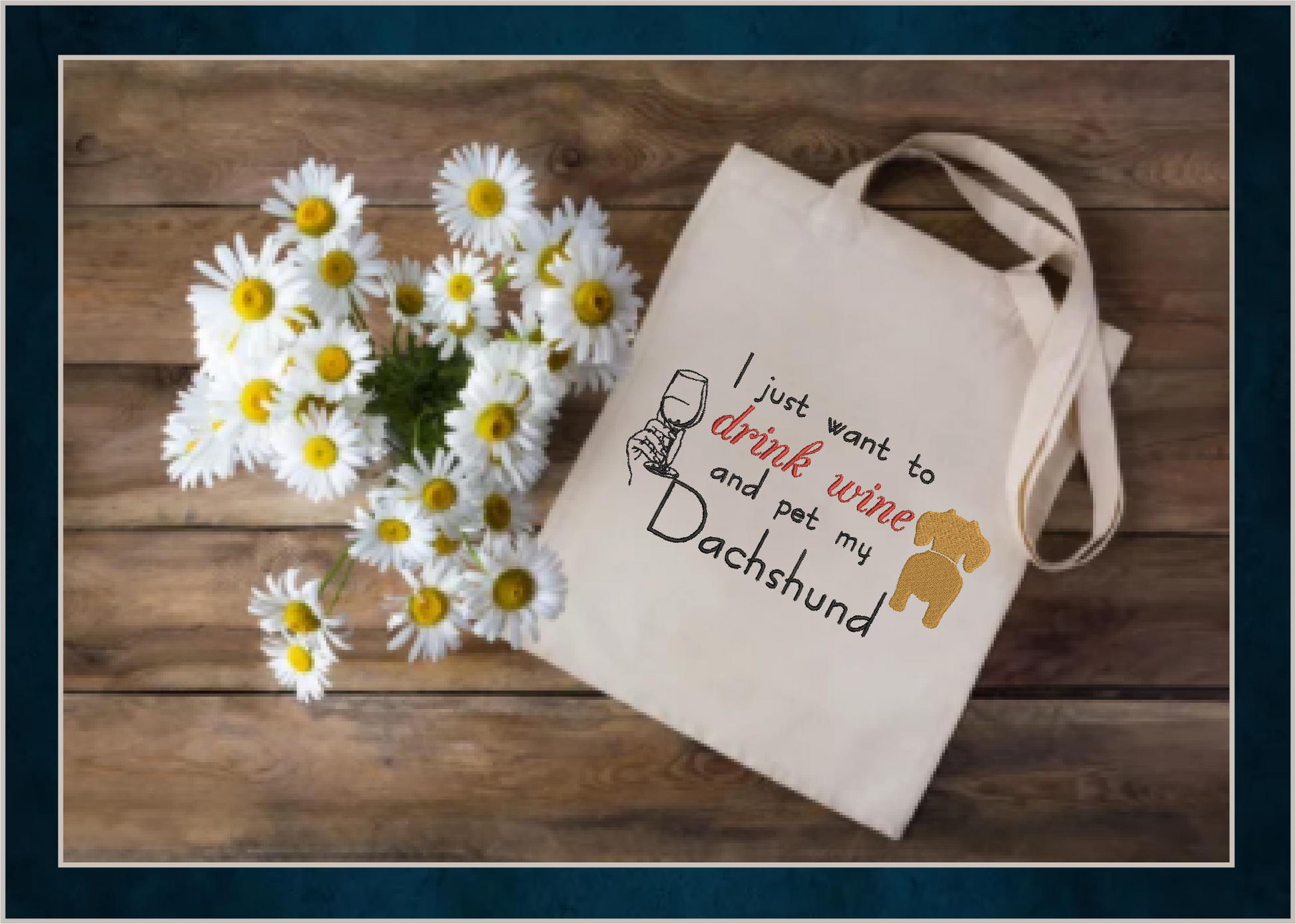 Wine and Dachshund Embroidery Design – Drink Wine & Pet My Dachshund Quote, Dog Lover Machine Embroidery, 4 Sizes (0433)