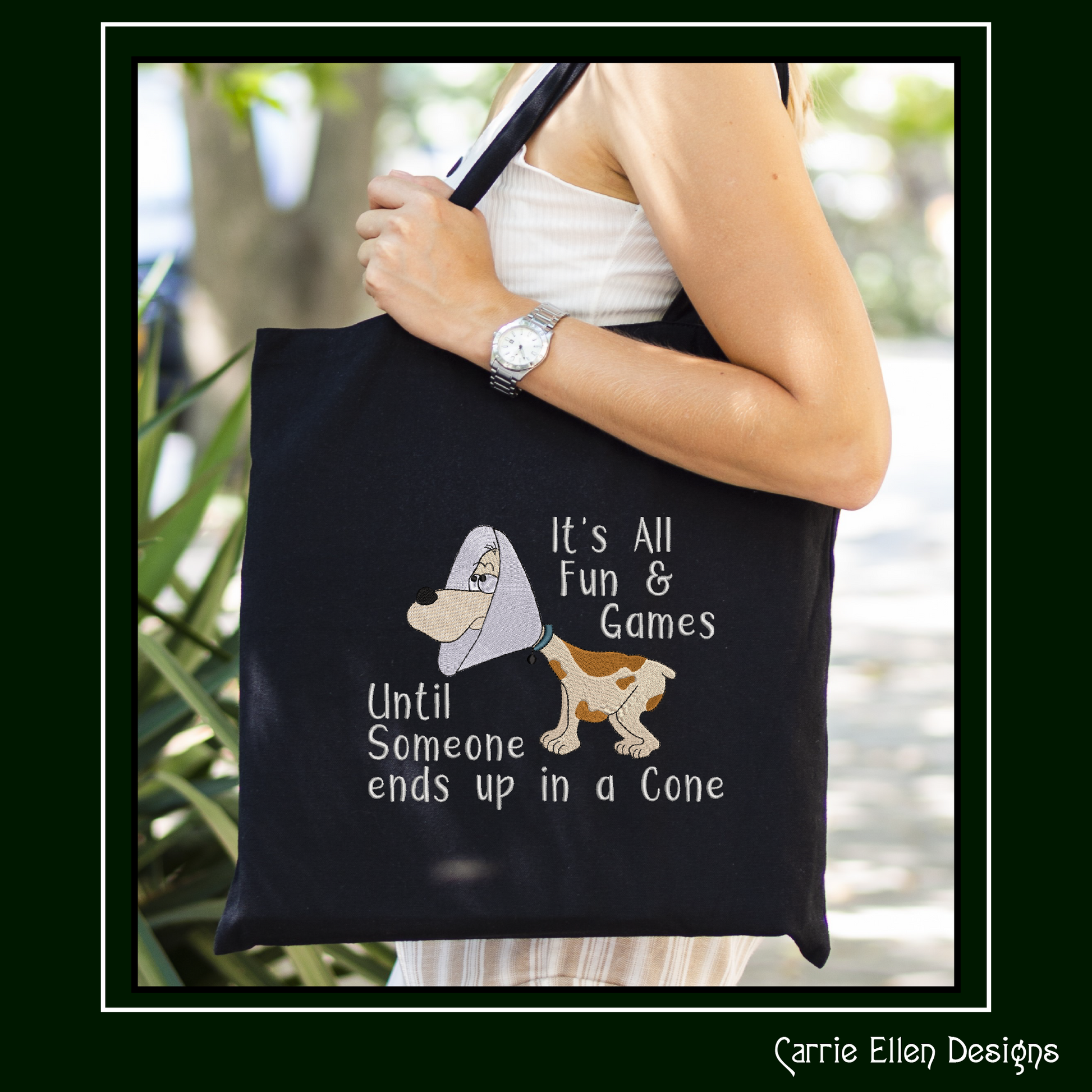 Add a touch of humor to your favorite garment or home décor item with our Dog Humor Machine Embroidery Design! This funny saying, "It's all fun and games until someone ends up in a cone," is sure to bring a smile to your face.. This witty embroidery design features a cartoon dog wearing the always iconic cone collar. The design is full of personality, combining a funny saying with a charming, dog-themed aesthetic that will brighten up any item it’s embroidered on.