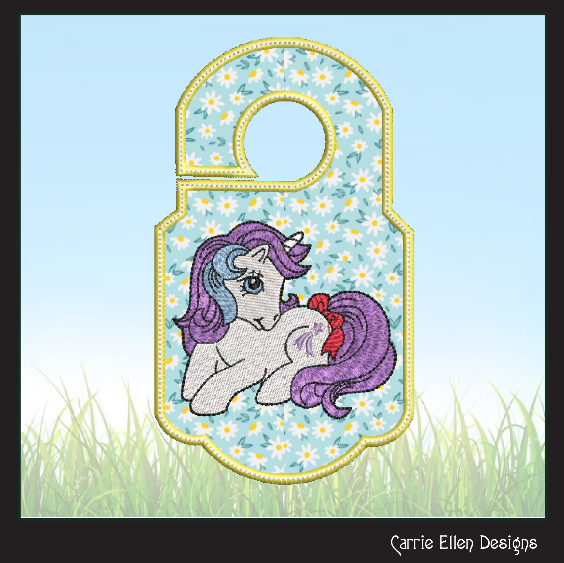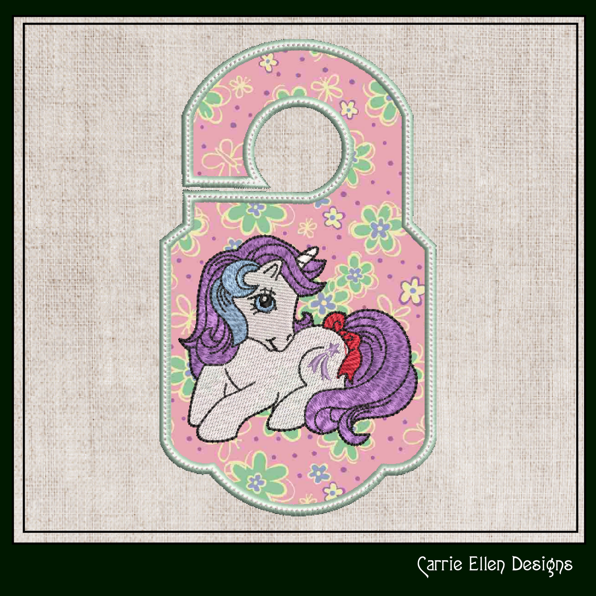 Add a touch of magic and nostalgia to your space with this ITH MLP Glory Door Knob Hanger Machine Embroidery Design! Featuring the fan-favorite unicorn Glory from the classic My Little Pony series, this In The Hoop (ITH) project is a charming way to decorate bedrooms, playrooms, or craft spaces.