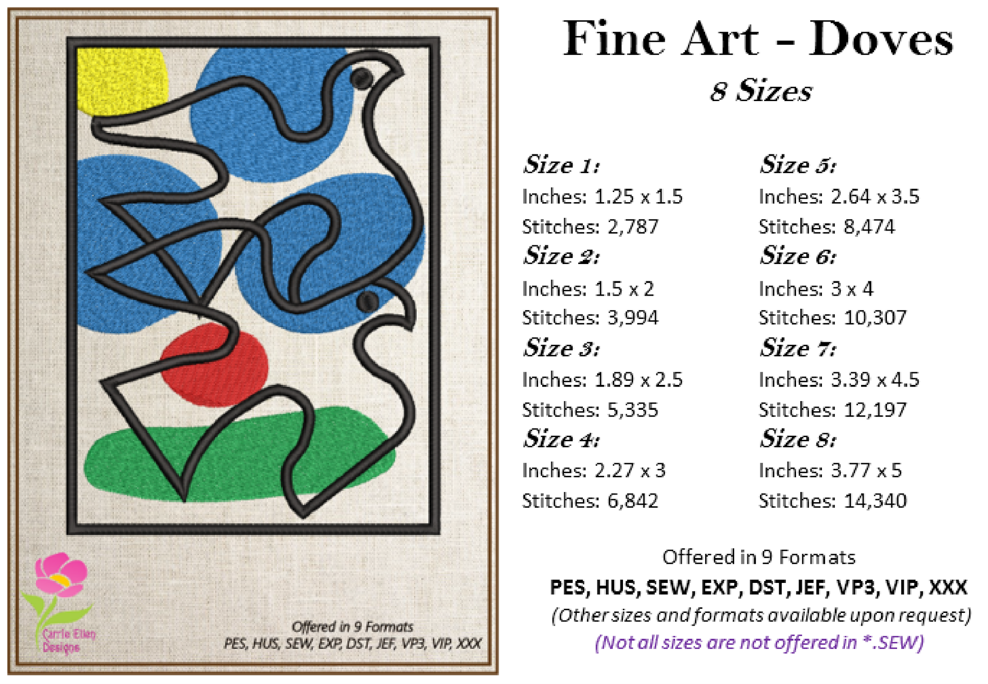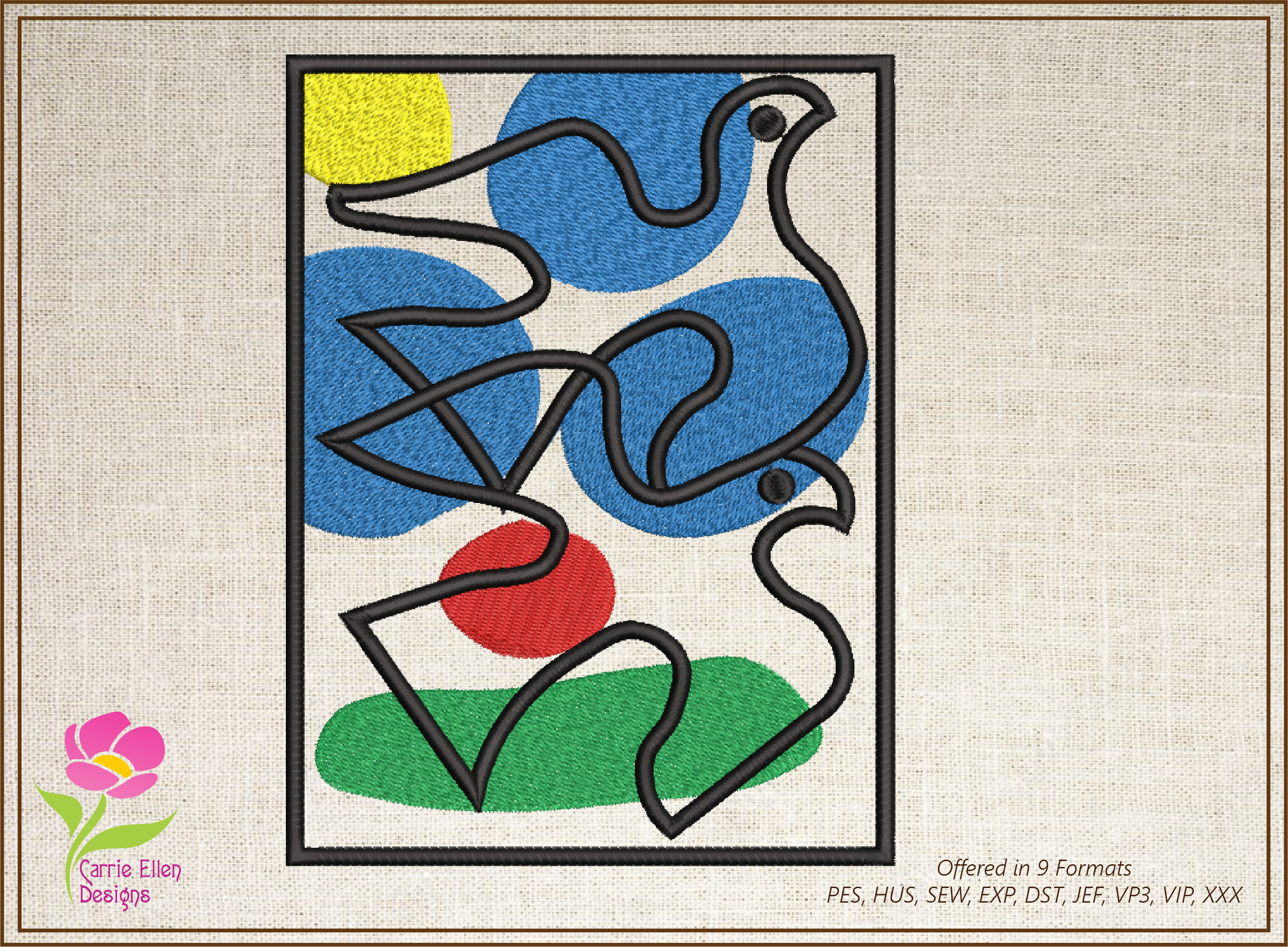 Celebrate peace, beauty, and fine art with this Doves Machine Embroidery Design, inspired by the iconic style of Celestino Piatti. This vibrant multicolor dove motif captures the spirit of Piatti’s artistic legacy, blending bold lines with eye-catching color for a truly unique embroidery piece.