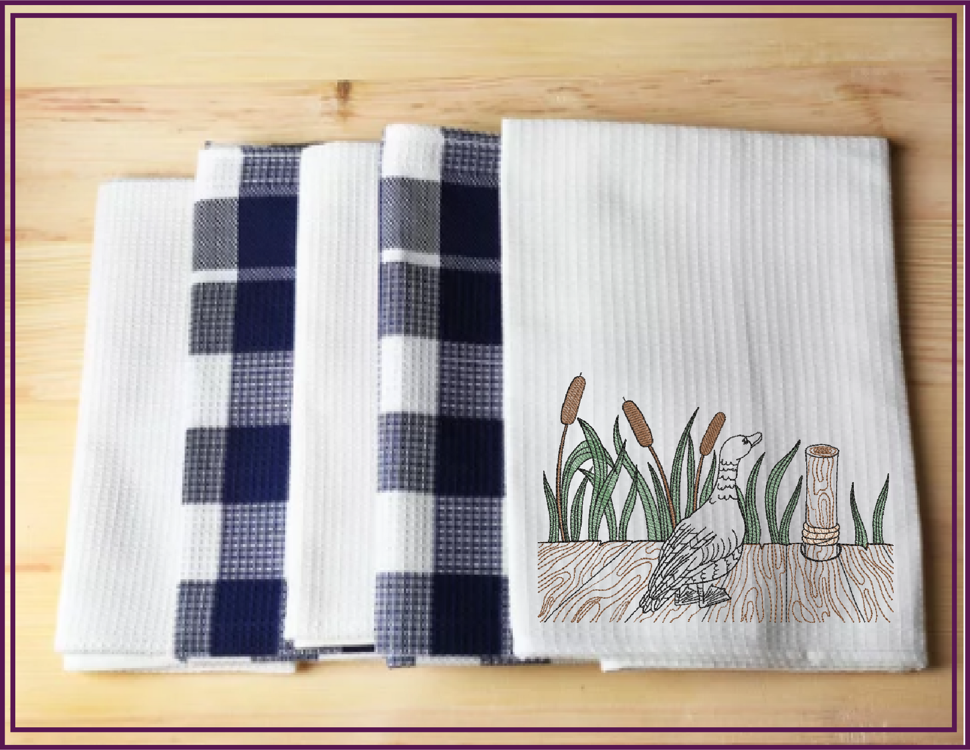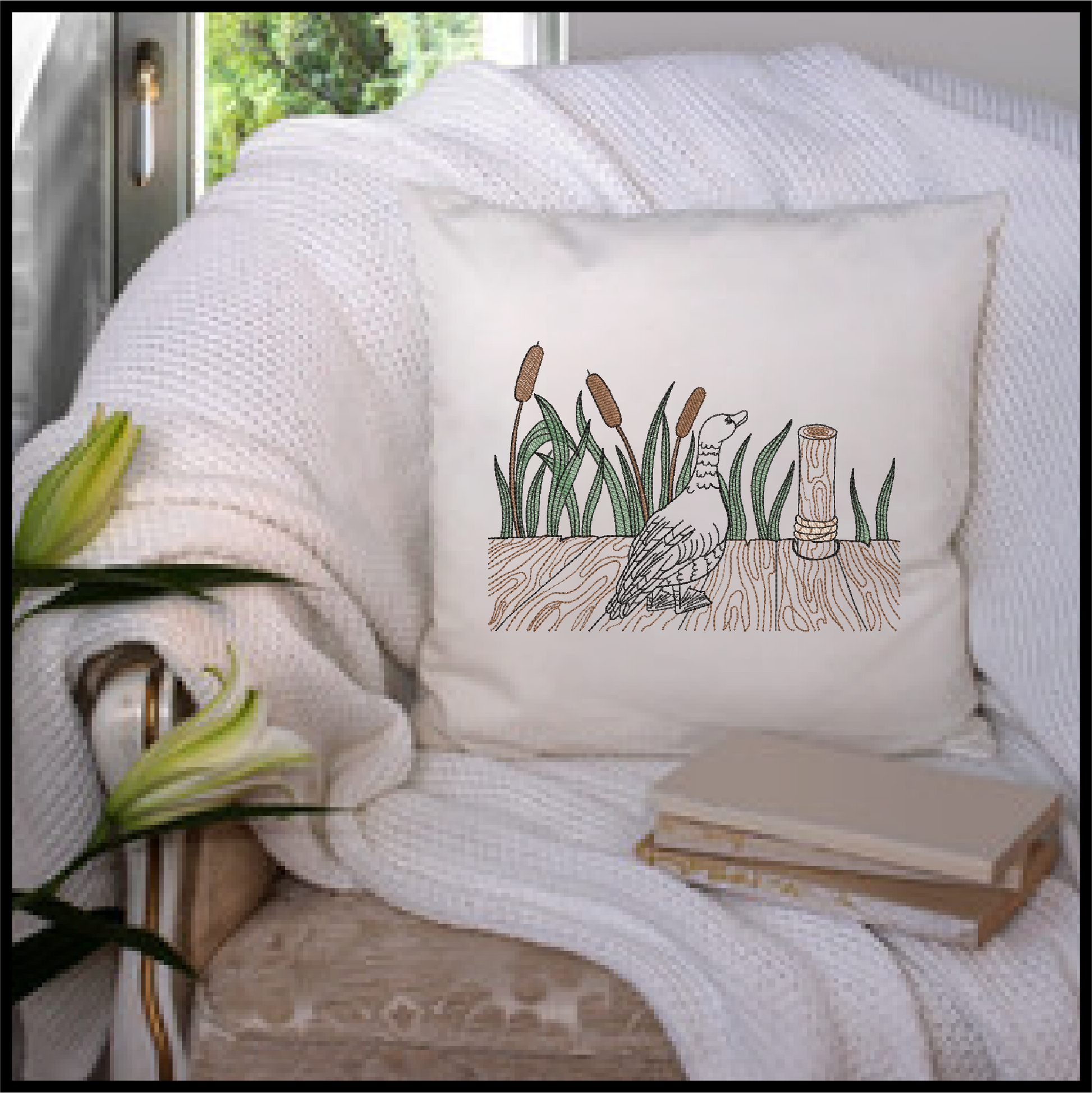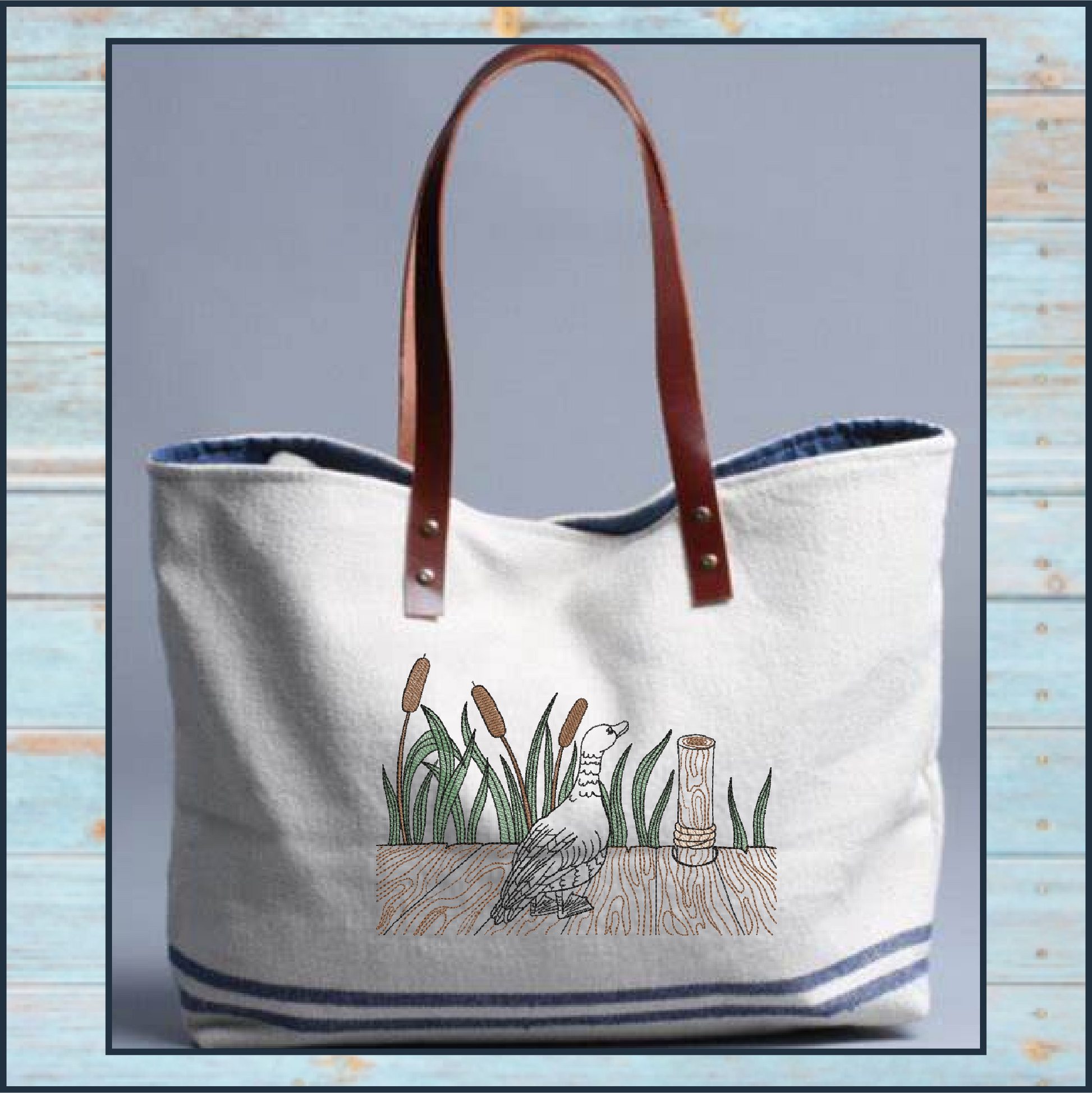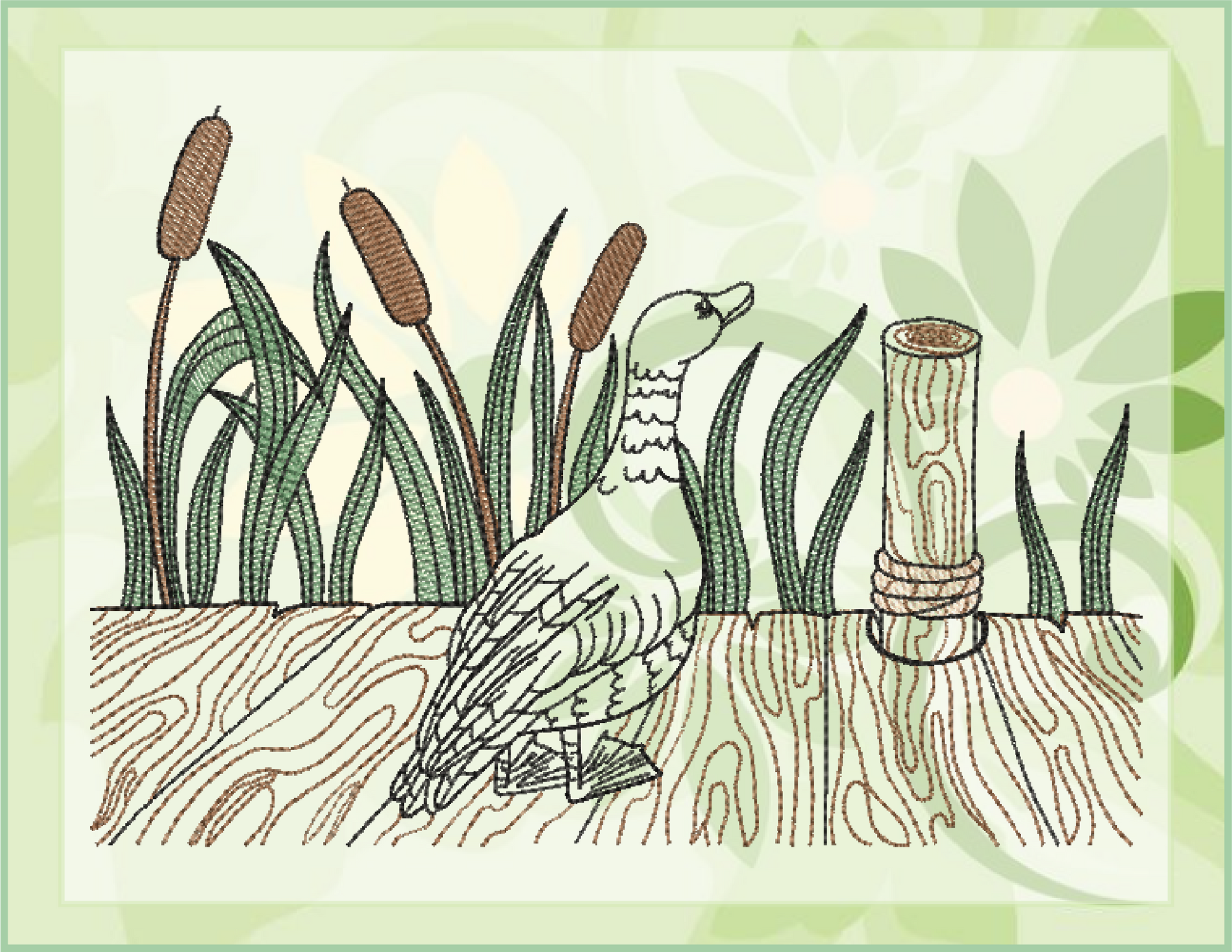 Duck on Dock Embroidery Design – Bird Line Art – Lakeside Machine Embroidery File, 6 Sizes (0666)