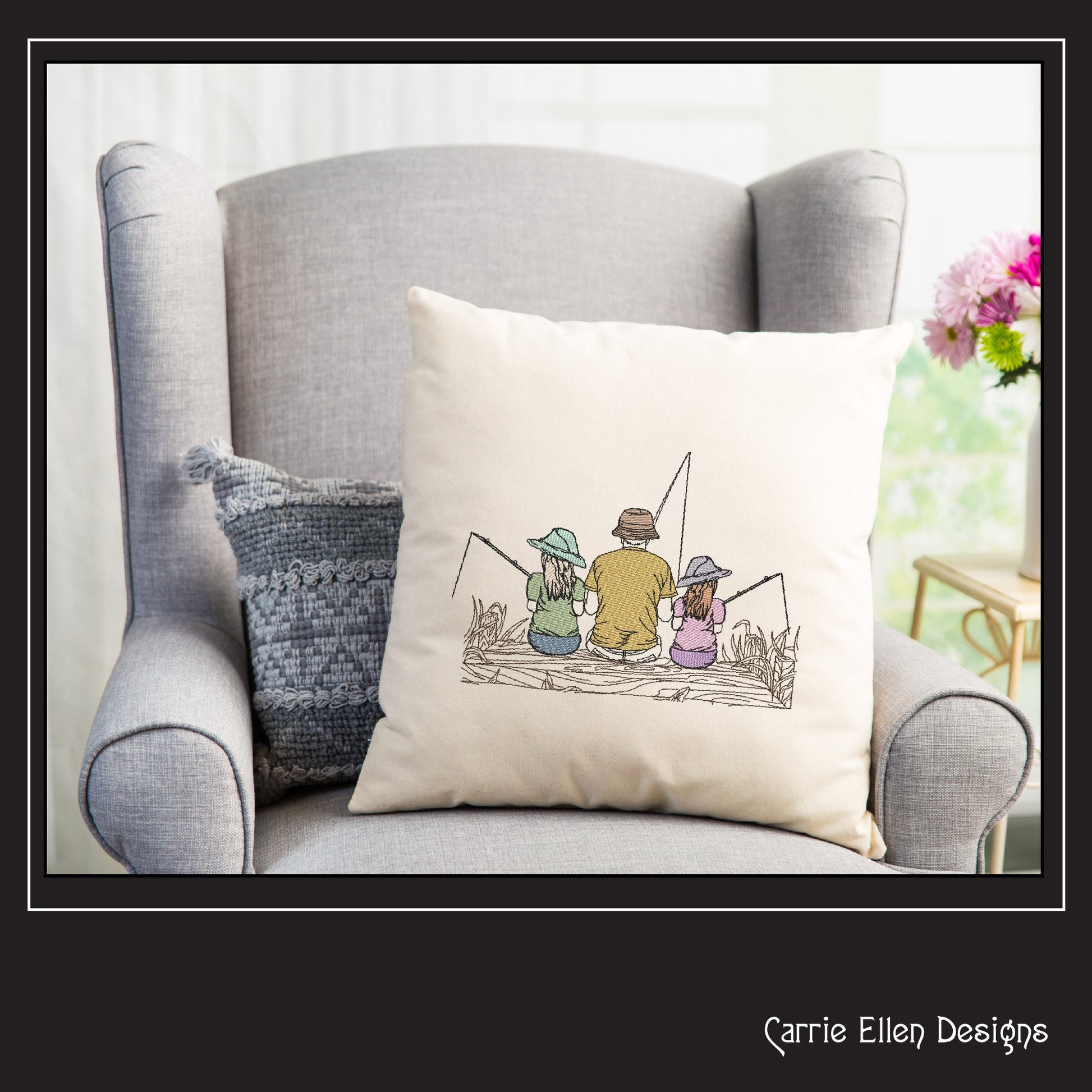 Touching sketch-style embroidery of a dad fishing with his daughters