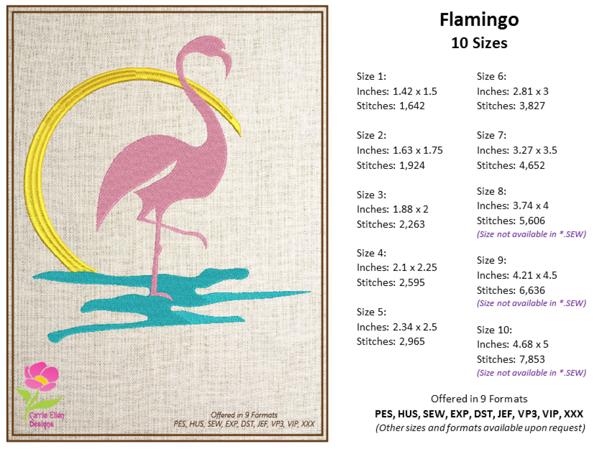 Perfect for summer decor, beach bags, towels, apparel, or gifts for bird lovers, this design offers clean lines and beautiful detail for smooth stitching results. Whether you're dreaming of island vibes or love flamingos, this design is a fun and creative way to bring paradise to your projects!