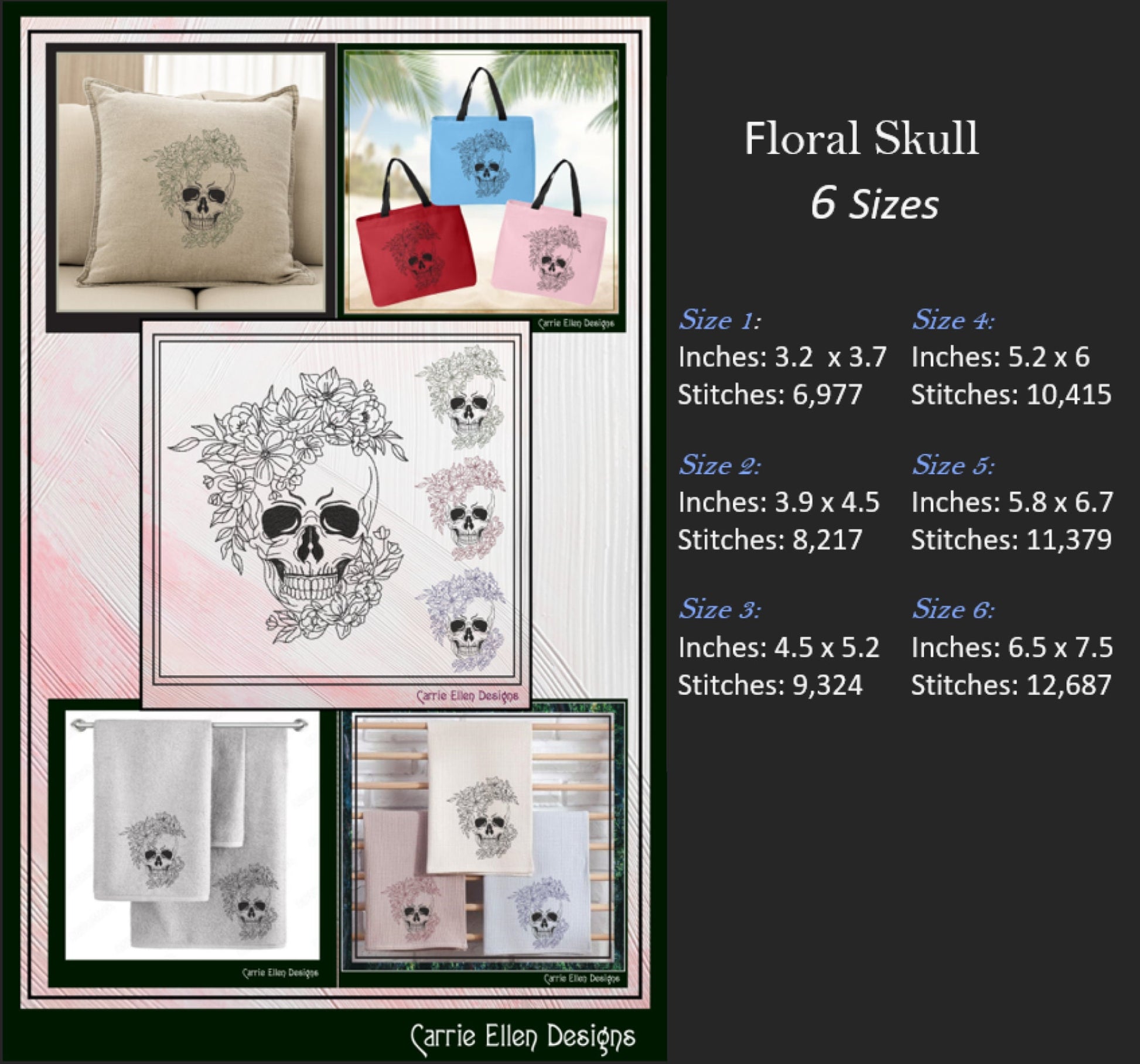 Floral Skull Embroidery Sketch Design, Leaves Wreath Skeleton Machine Embroidery Design, Halloween Line Art Embroidery, 6 Sizes (2713)
