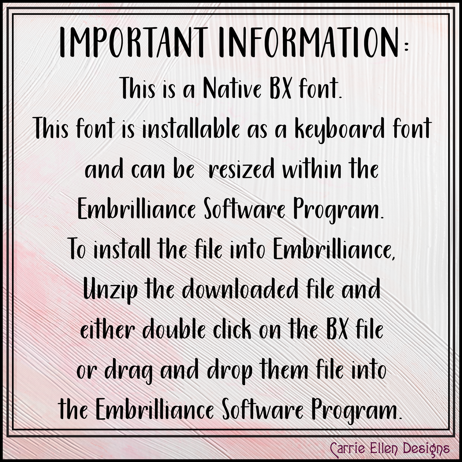 This font is compatible with EMBRILLIANCE, a free program you can download to use these BX files, which allows you to use your computer keyboard to create the lettering. Type, resize, and customize effortlessly—then send your stitched masterpiece straight to your embroidery machine!