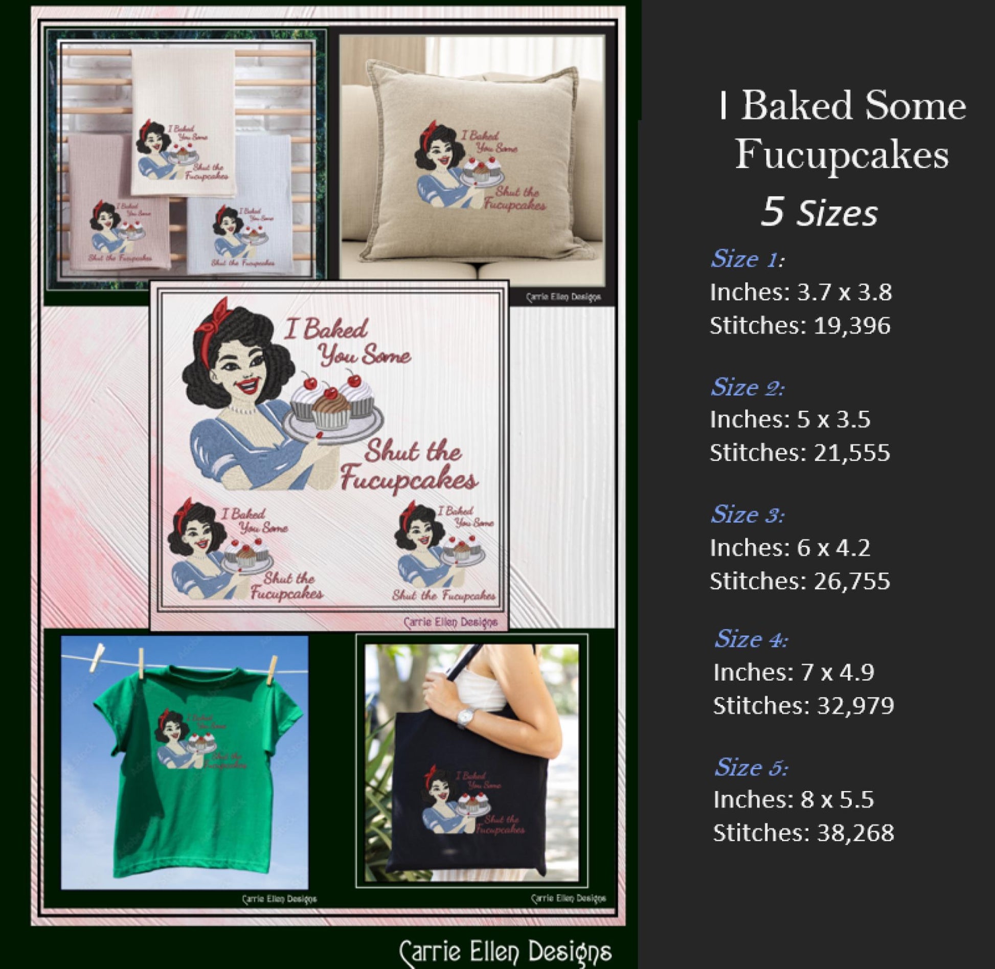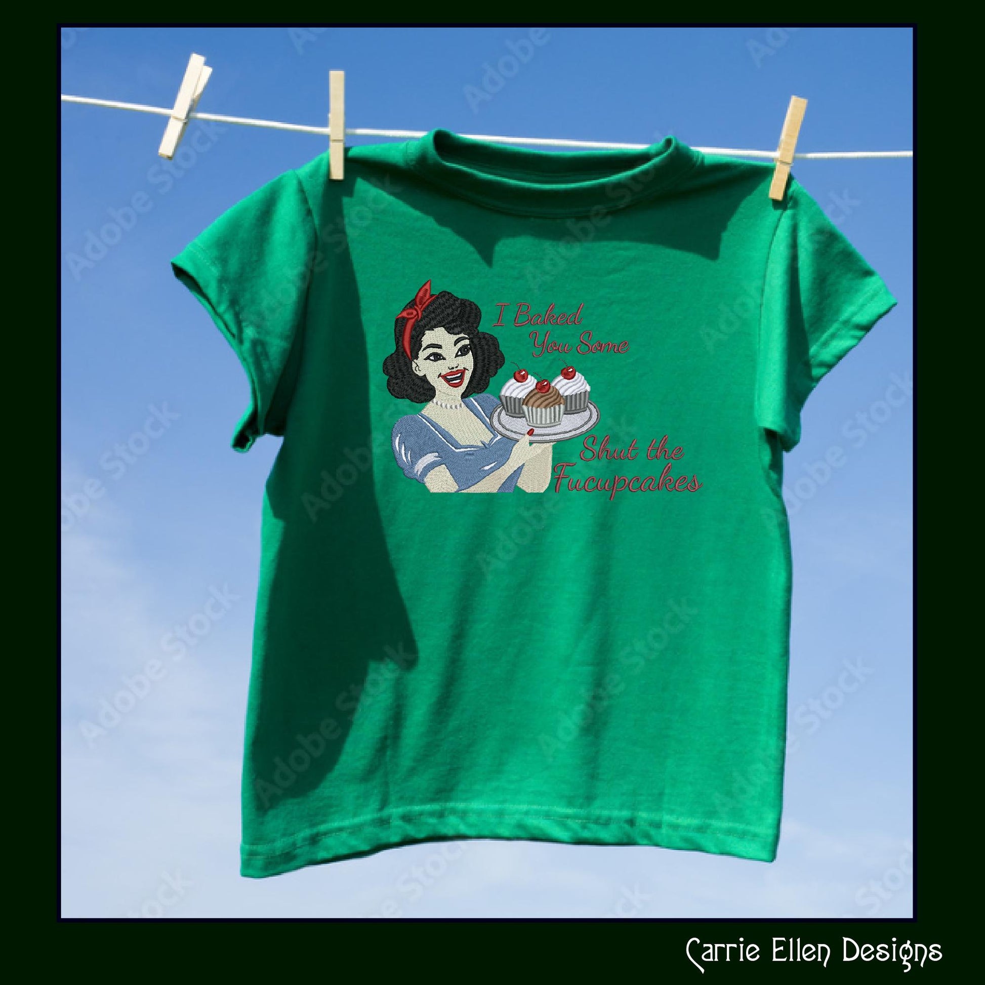 Add a touch of vintage charm and snarky humor to your next embroidery project with our "I Baked You Some Shut the Fucupcakes" machine embroidery design. Featuring a retro housewife holding a plate of cupcakes, this design is perfect for adding a playful twist to your creations. Available in 5 sizes, this design is sure to bring a smile to your face and a laugh to those who see it. Let your creativity shine with this unique and quirky embroidery design.