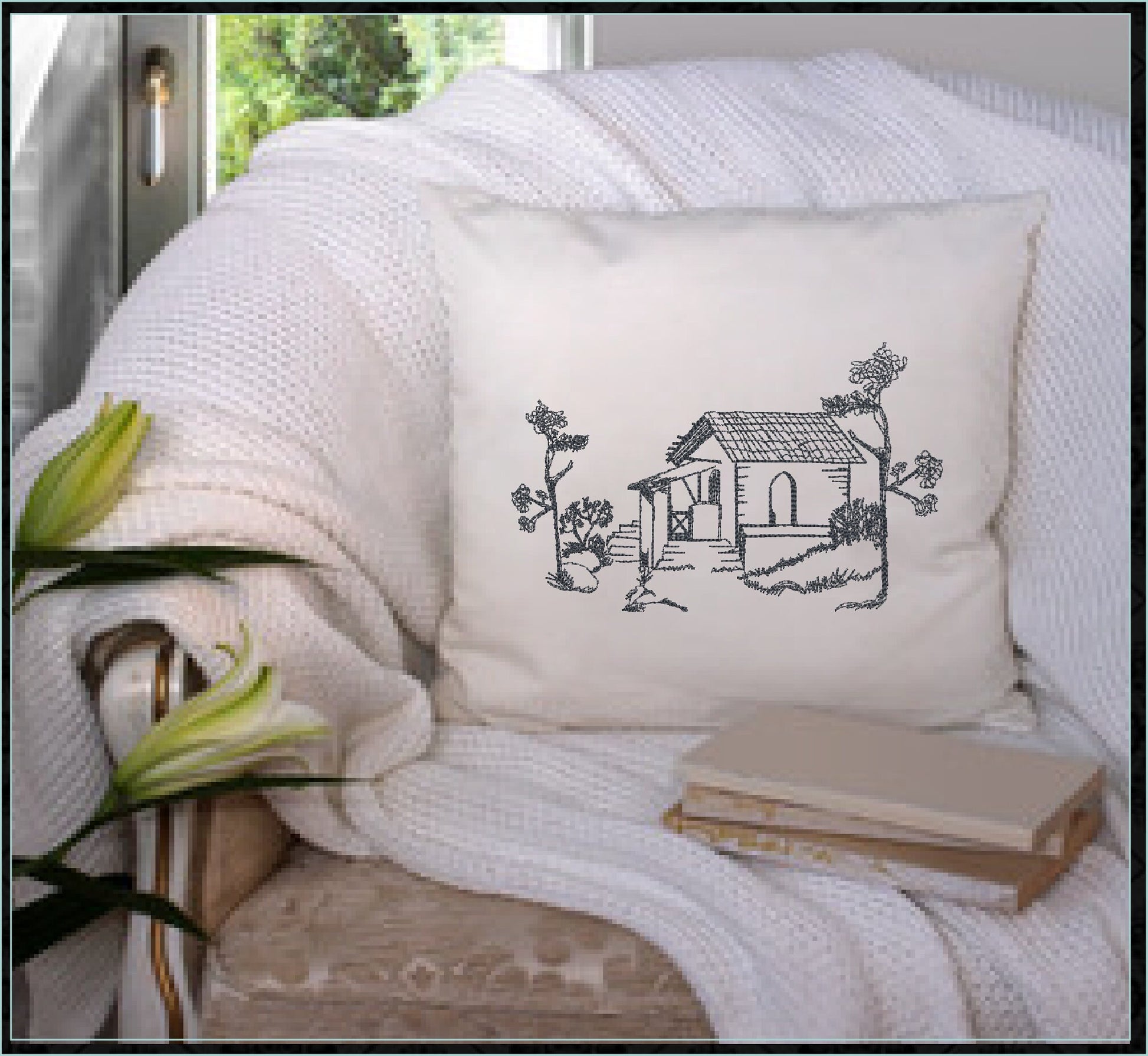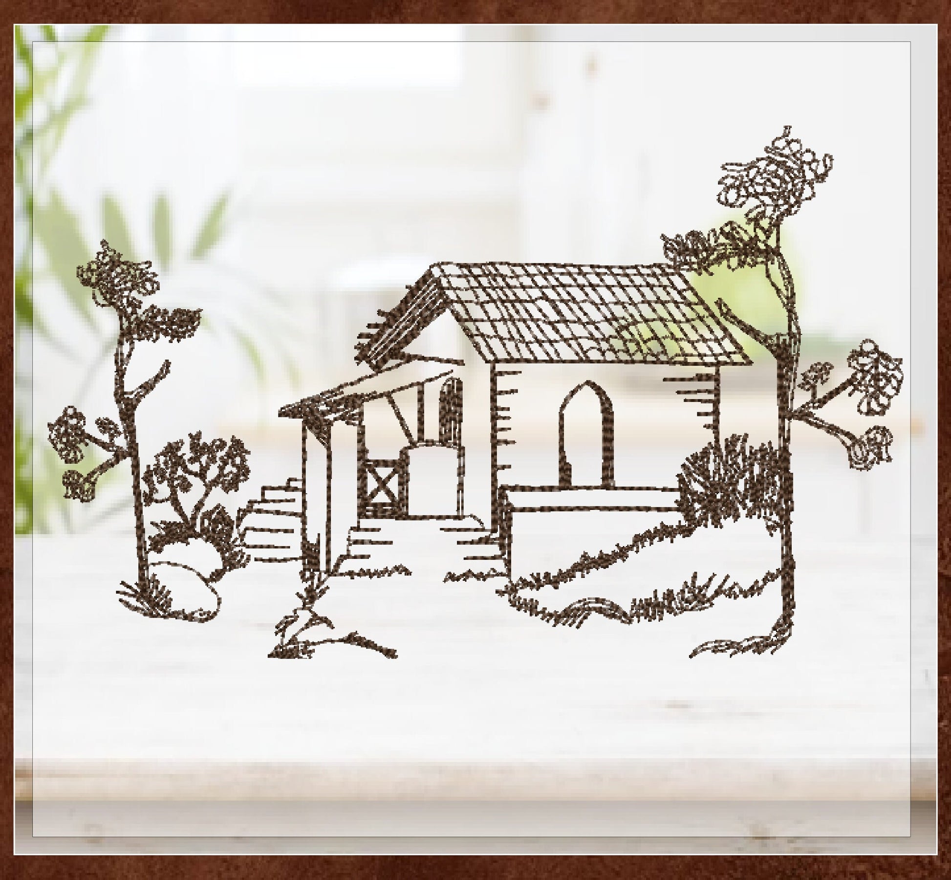 Garden Cottage Sketch Machine Embroidery Design | Artistic Line Art Landscape Design | Cottage Embroidery | 8 Sizes (0920)