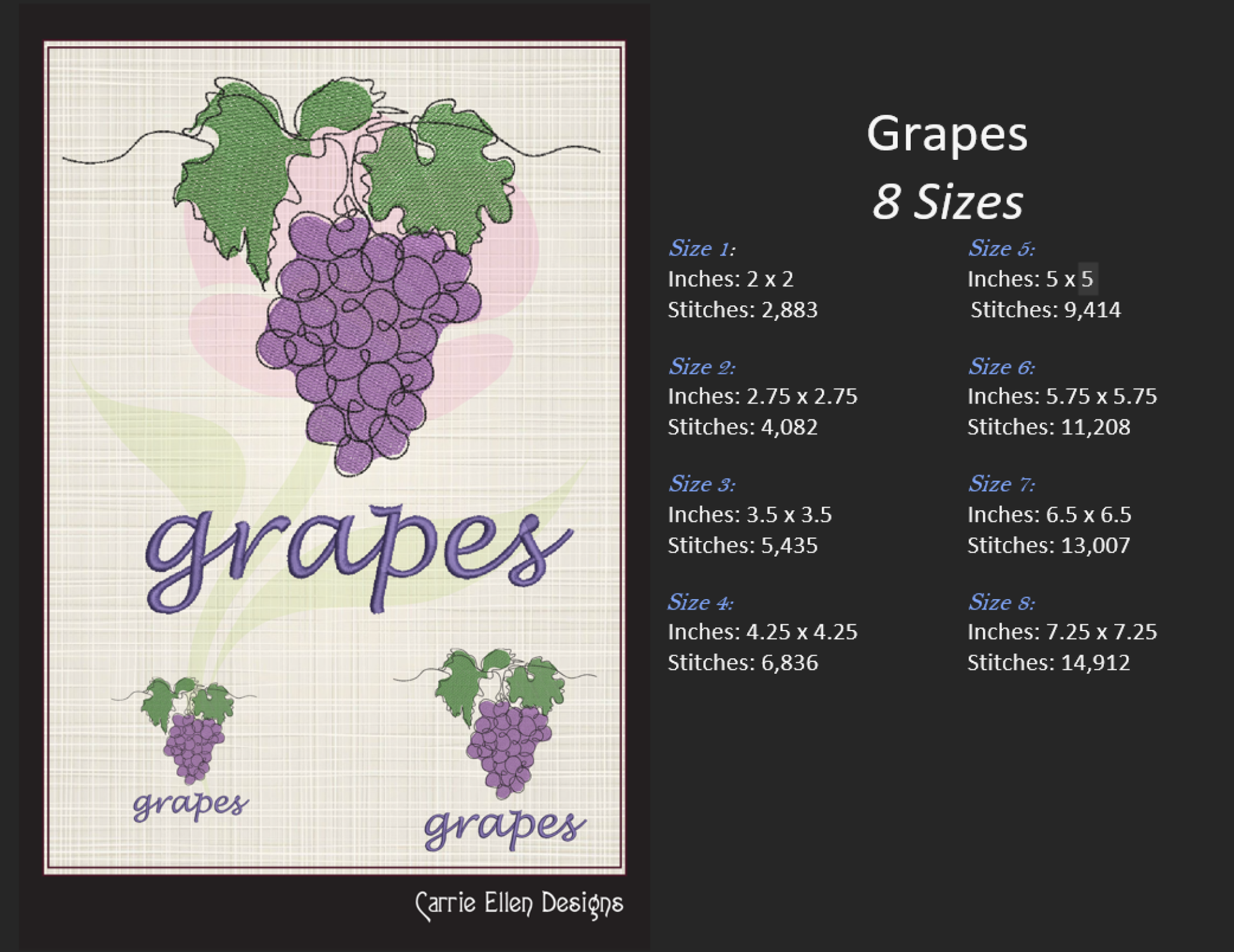 The 8 available sizes ensure that this grape design fits perfectly in projects of any size, from small accessories to large home décor pieces. Simple to stitch yet intricate in its detailing, it’s ideal for both beginners and experienced embroiderers.