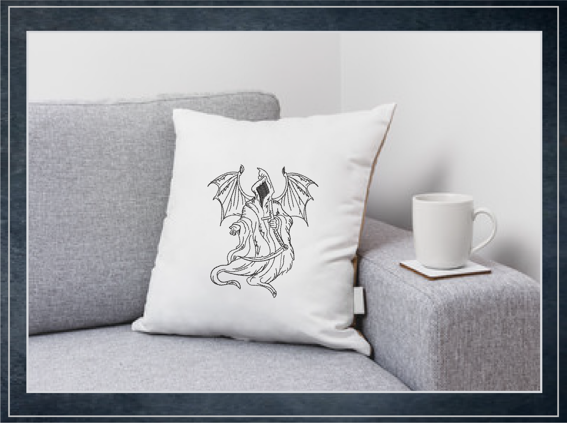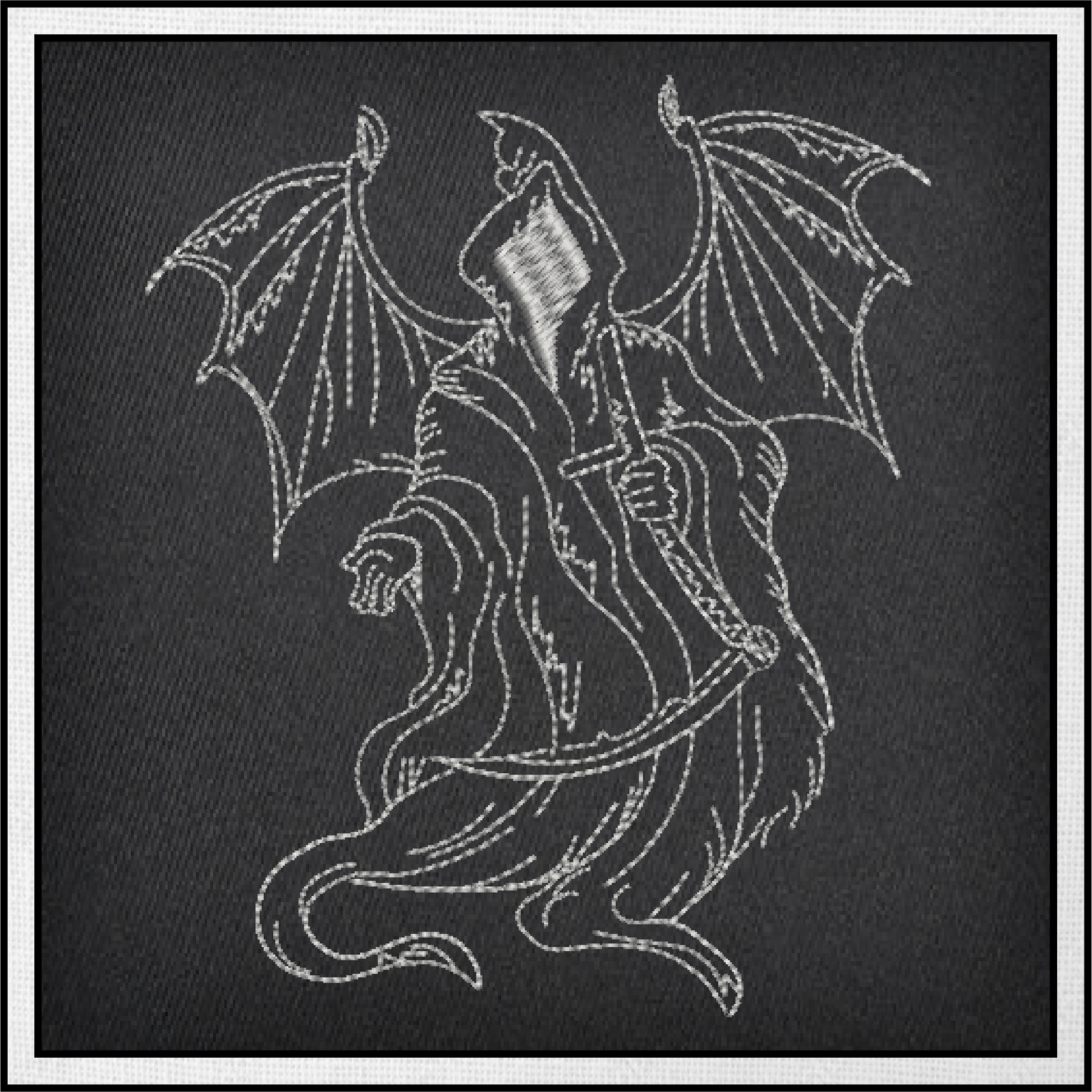 Bring a spooky, gothic edge to your embroidery projects with this Grim Reaper Machine Embroidery Design. Featuring a bold line art silhouette of the iconic reaper holding a sickle, this design is perfect for Halloween décor, dark fashion pieces, or fans of macabre and fantasy themes.