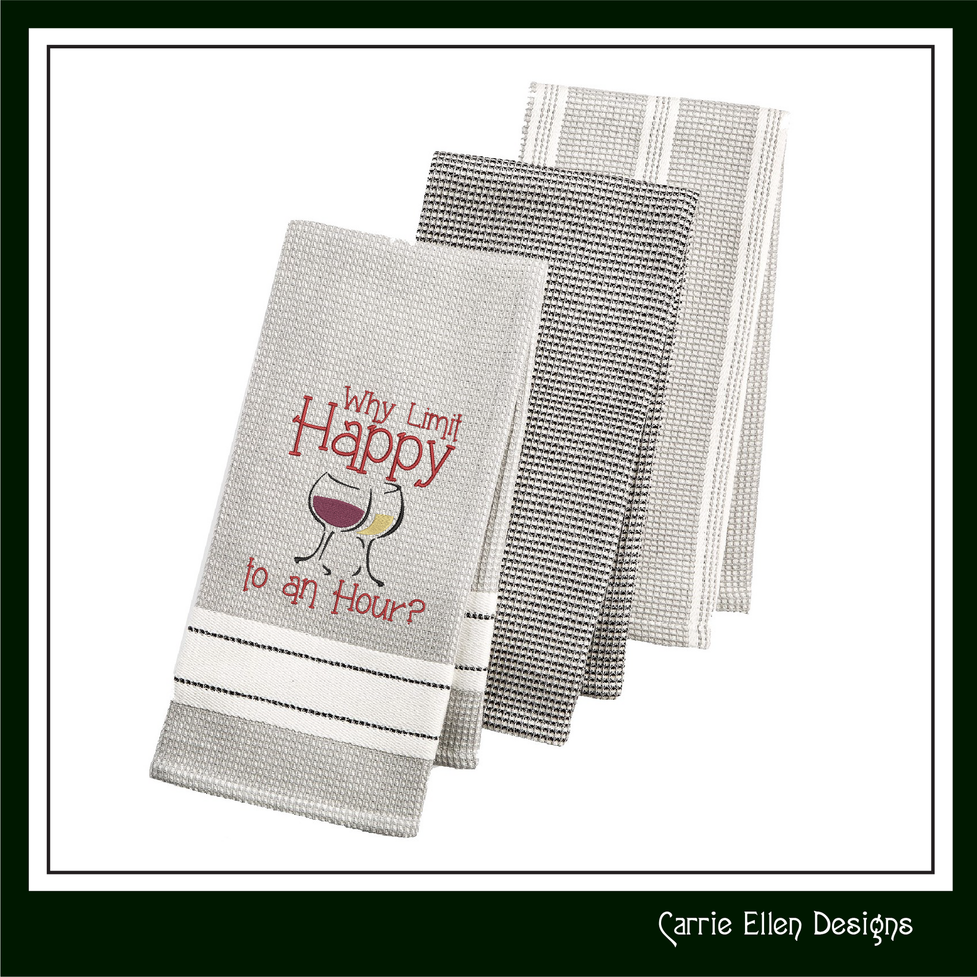 Add some fun and flair to your wine lover's collection with this Happy Hour Embroidery Design featuring the playful saying, "Why Limit Happy?" paired with a charming wine glass design. Perfect for creating personalized items like t-shirts, tote bags, wine accessories, or even kitchen décor, this design is sure to bring smiles and laughter to any occasion.