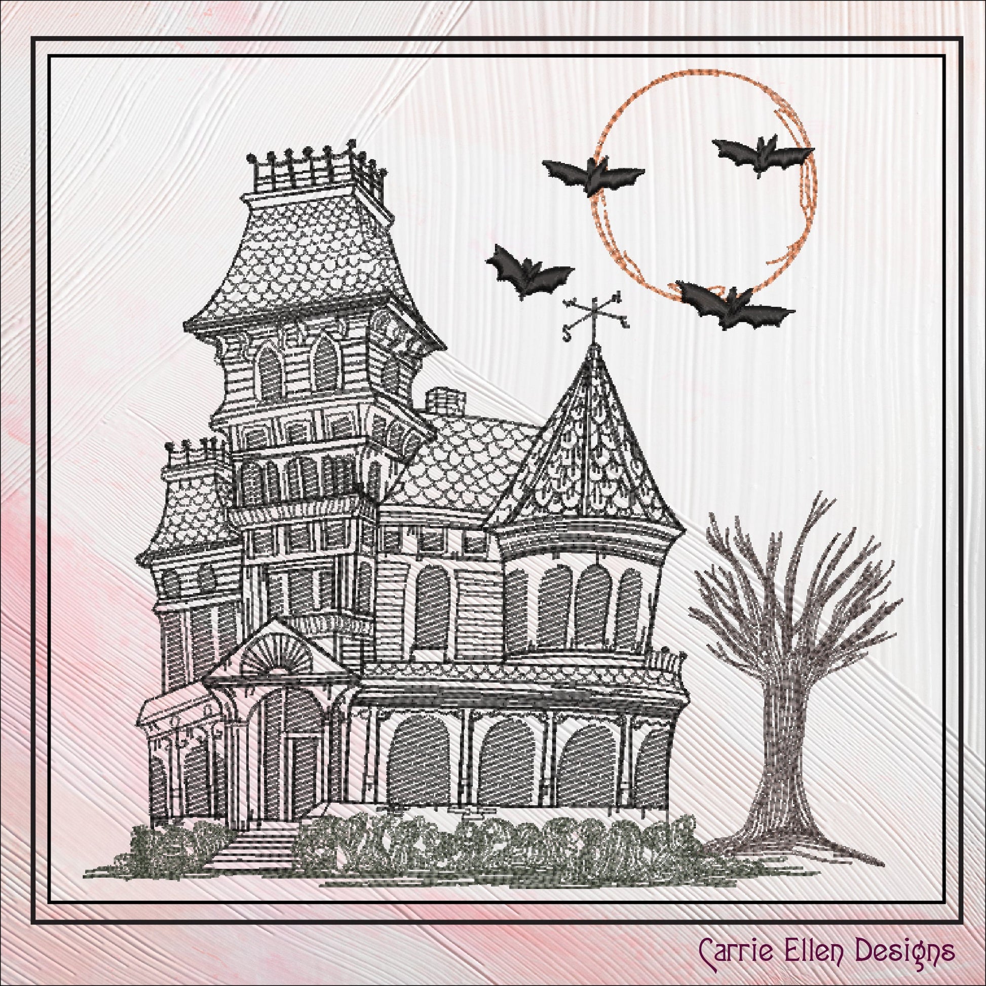 Haunted House Embroidery Sketch Design, Creepy House Machine Embroidery Design, Halloween Line Art Embroidery, 6 Sizes (2762)