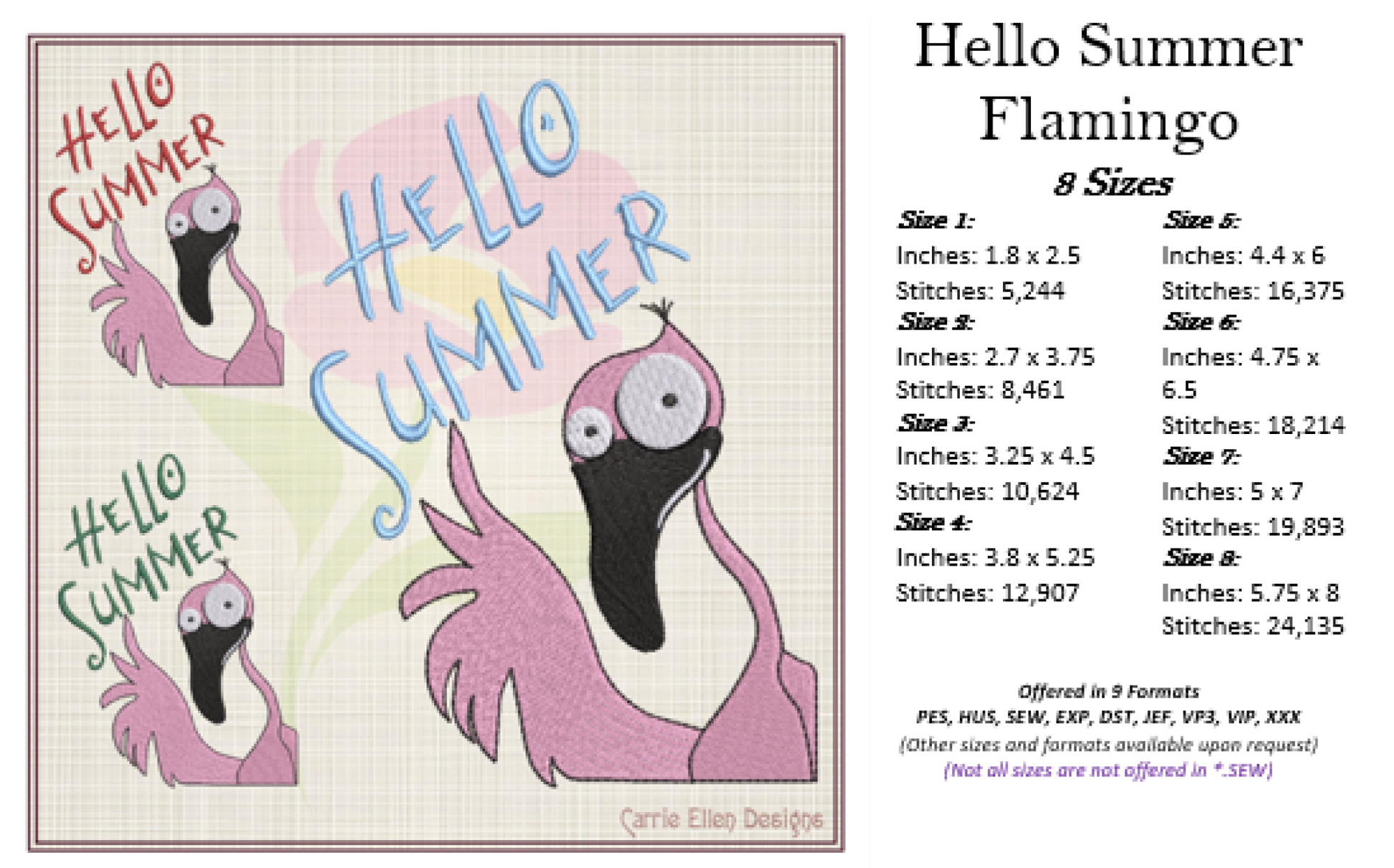 Bring a splash of tropical fun to your summer projects with our Hello Summer Flamingo Machine Embroidery Design! Featuring a vibrant flamingo alongside a playful "Hello Summer" saying, this design captures the easygoing spirit of the season. Perfect for beach bags, summer apparel, pool towels, garden flags, or tropical party décor, this embroidery pattern adds a lively and sunny touch to any project.