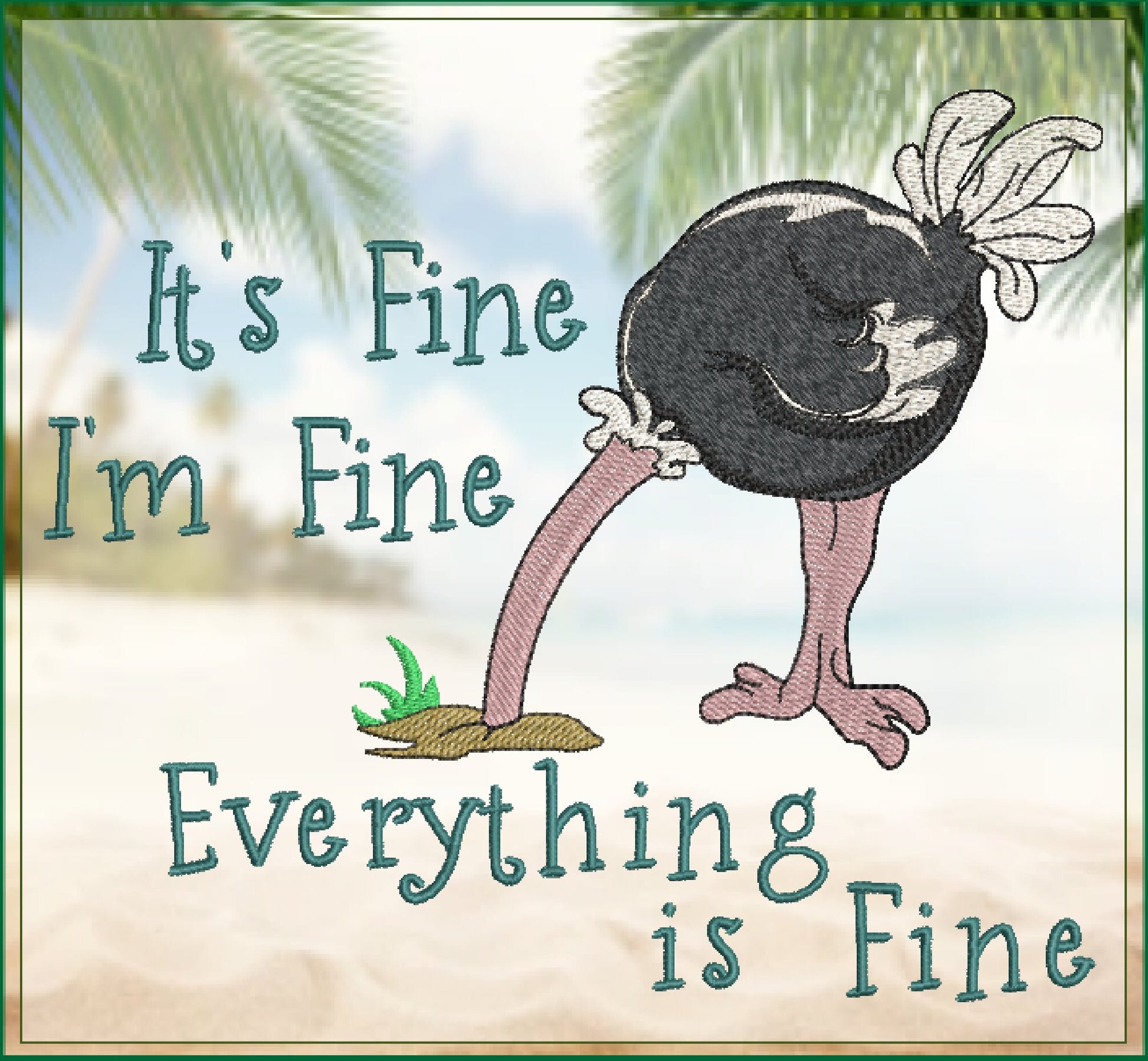 Bring humor to your embroidery projects with our "Im Fine, Everything is Fine" Ostrich with Head in the Sand Machine Embroidery Design. This amusing design features a quirky ostrich with its head buried in the sand, perfectly capturing the playful essence of the popular saying. Whether you want to add some comedic flair to your home decor, apparel, or gifts, this funny design is sure to get a laugh.