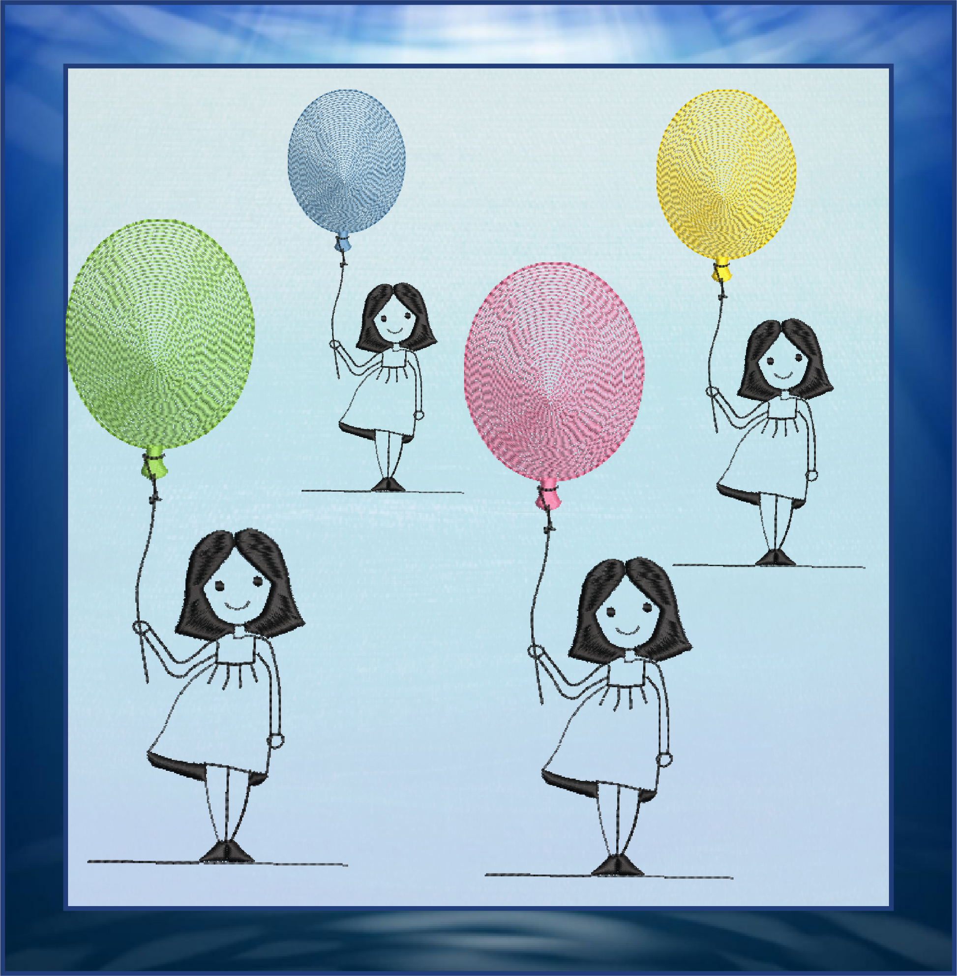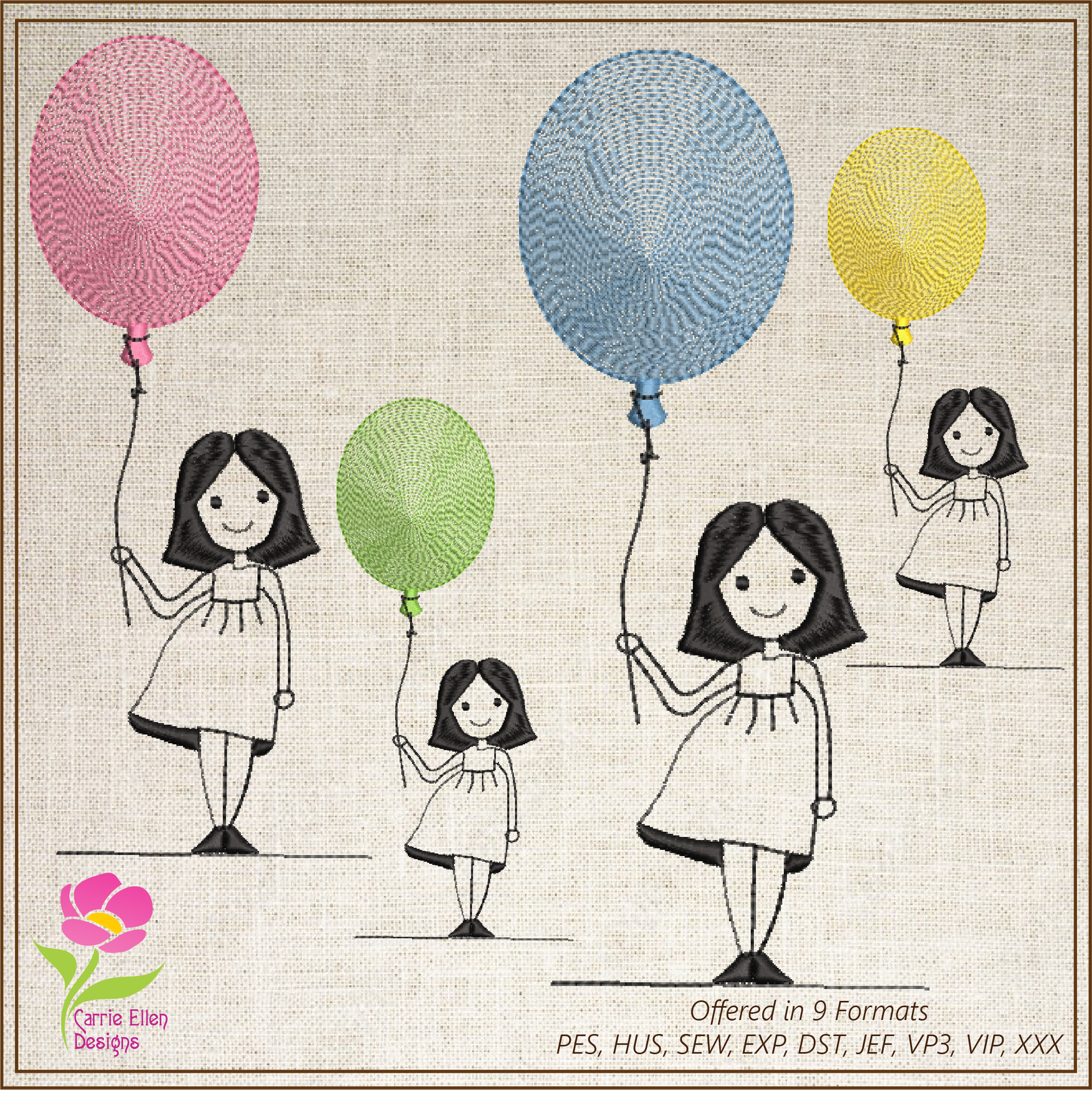 Little Girl with Balloon Machine Embroidery Design – Birthday Girl Embroidery – Cute Kids Outline Sketch – 8 Sizes (0233)