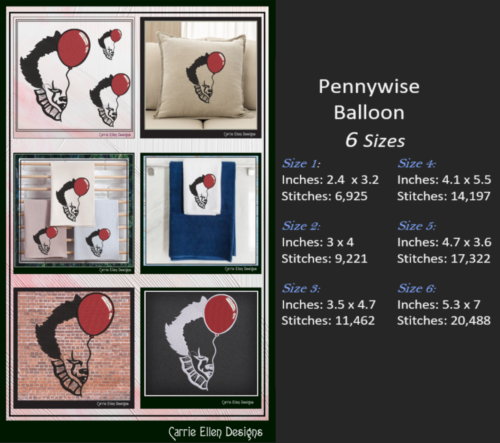 Pennywise the Clown Balloon Machine Embroidery Design – Horror Movie Inspired Pattern, 6 Sizes (2805)