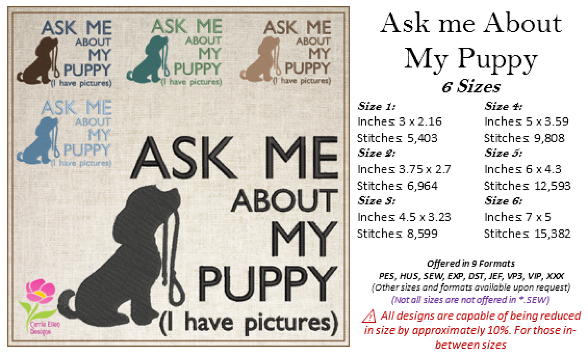 Celebrate your love for puppies with this Puppy Dog Machine Embroidery Design! Featuring the playful and heartwarming saying “Ask Me About My Puppy,” this embroidery design is perfect for pet lovers, dog owners, and anyone who can’t get enough of their furry friend. Available in 6 different sizes, this design works wonderfully for creating unique accessories, home décor, and apparel.