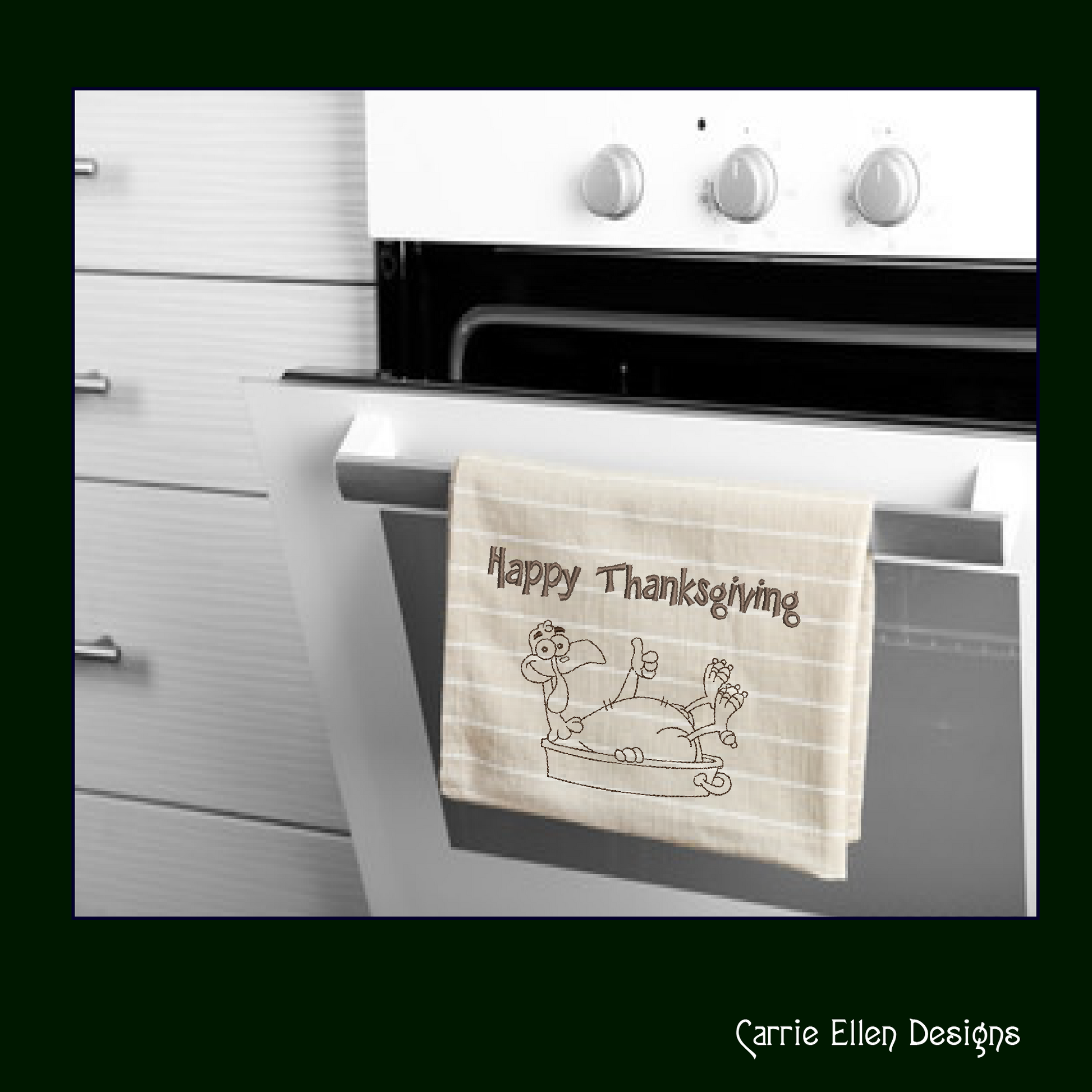 Perfect for aprons, kitchen towels, table runners, holiday napkins, and Thanksgiving decorations, this fun design stitches out beautifully and brings a smile to every Thanksgiving gathering.