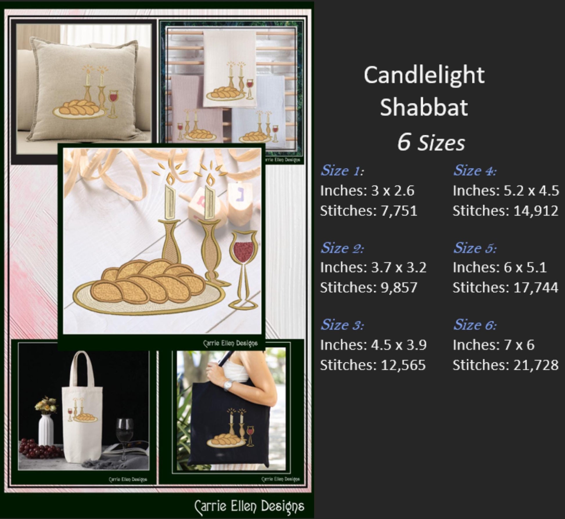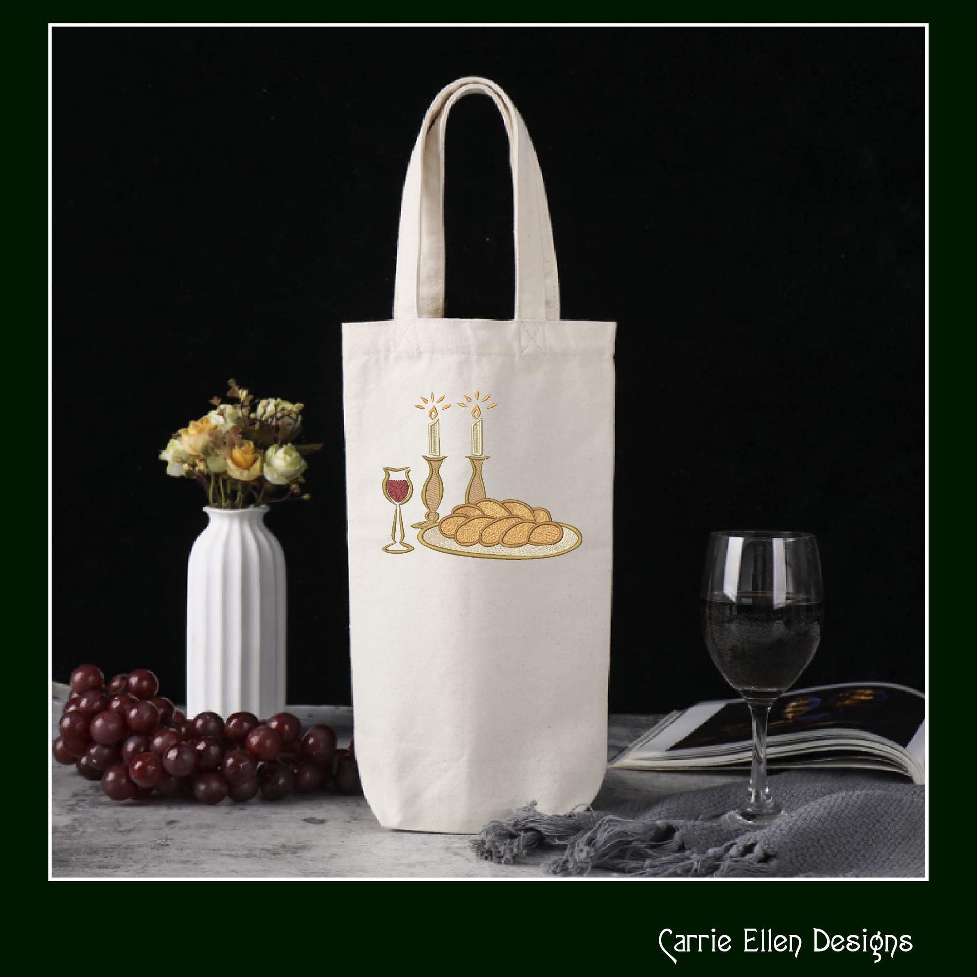 Candlelight Shabbat Machine Embroidery Design, Shabbat Candles Judaism Religious Design, Challah Wine and Candles, 6 Sizes (3069)