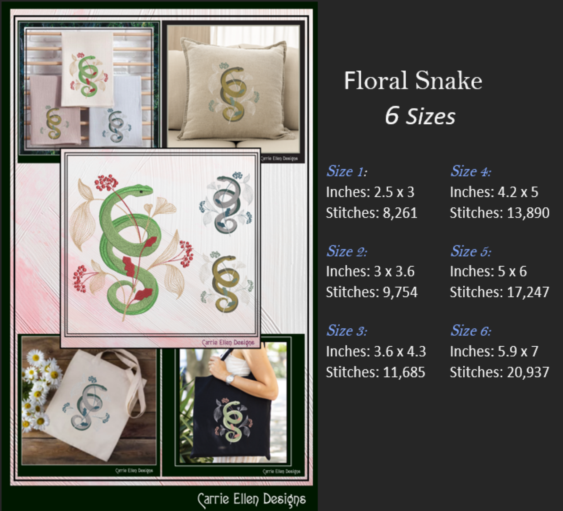 Decorative Snake Machine Embroidery Design, Snake Entwined with Leaves and Flowers, 6 Sizes (3205)