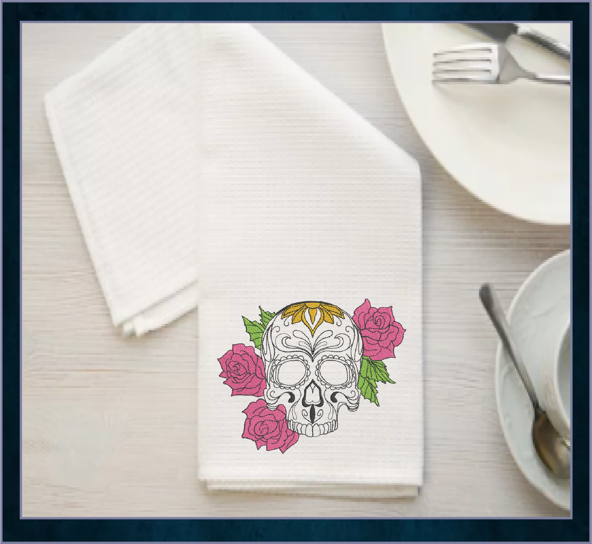 Use vibrant thread colors for the roses and skull details to make your project pop with traditional Mexican festivity.