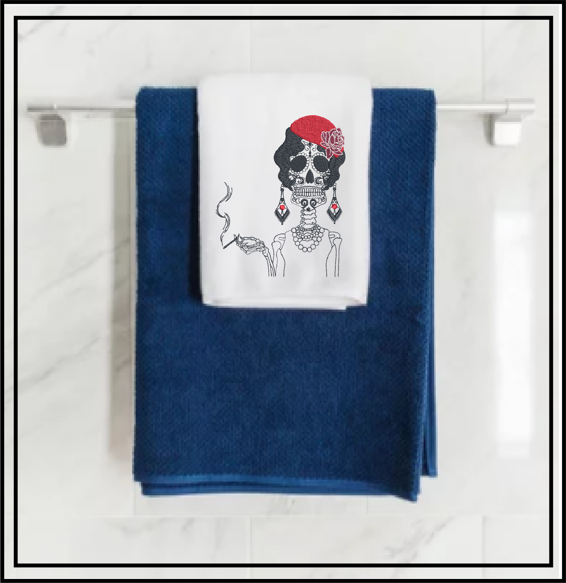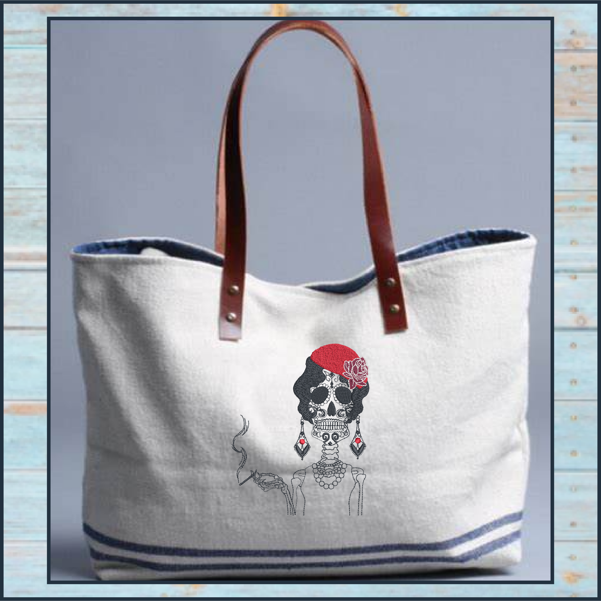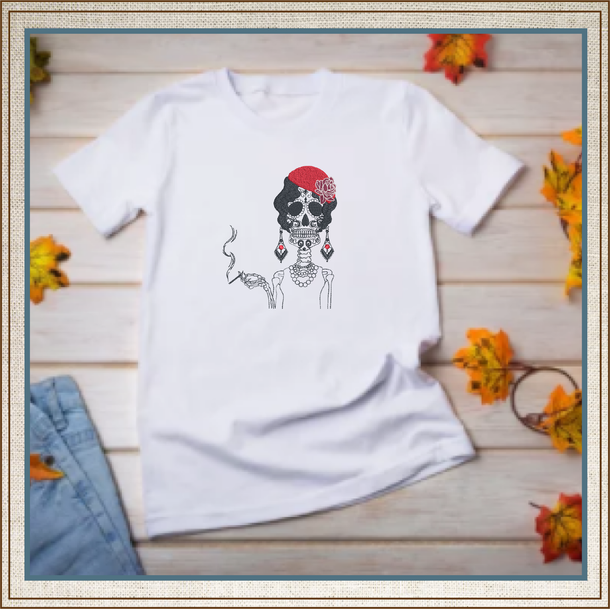 Embrace the elegance and boldness of the Sugar Skull Woman Machine Embroidery Design, featuring a stunning Day of the Dead skeleton holding a classic cigarette. This unique design captures the vibrant spirit of Dia De Los Muertos, blending tradition with a touch of attitude. The intricate details, from the decorative sugar skull face to the smoking gesture, make it an eye-catching and memorable addition to any embroidery project.
