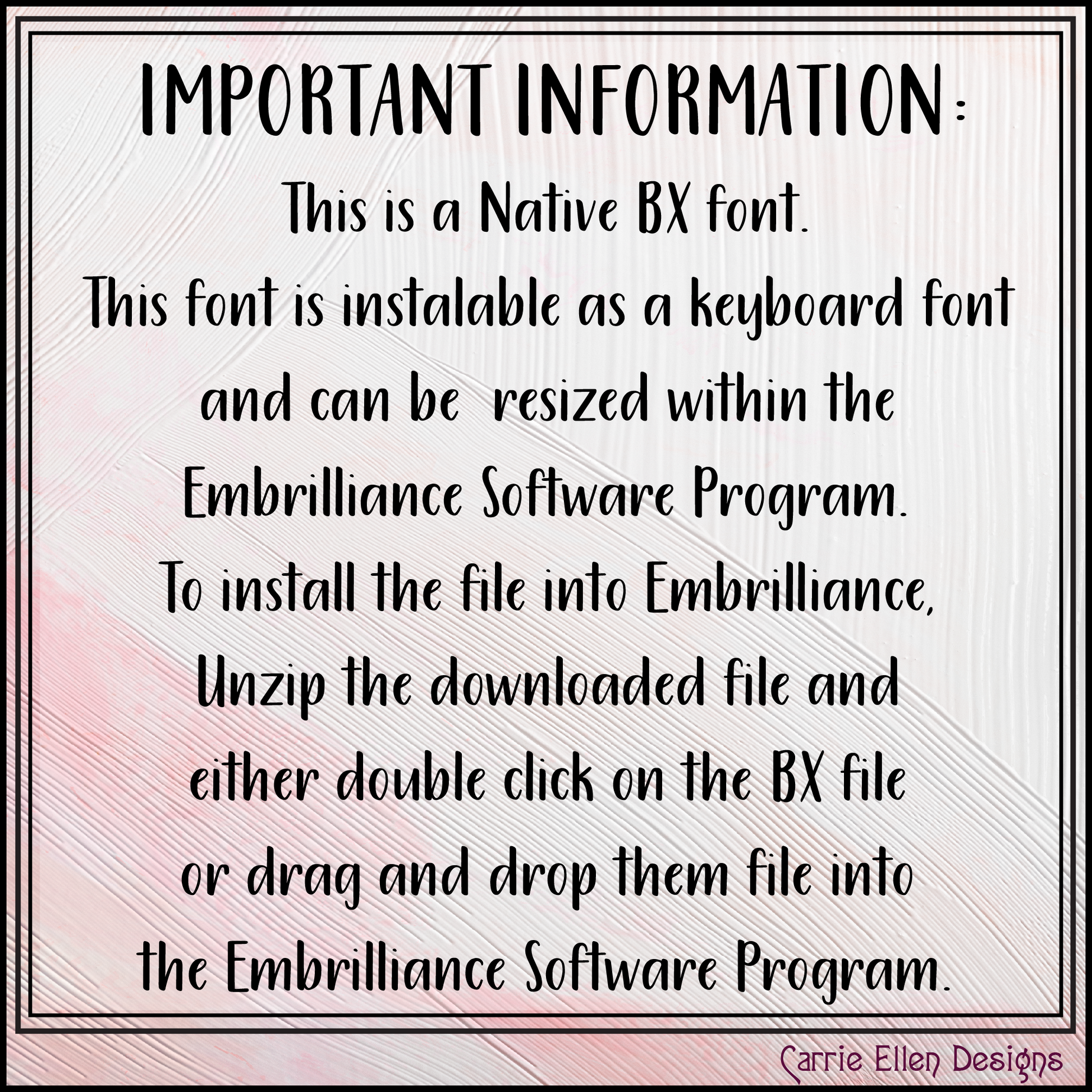 This font is compatible with EMBRILLIANCE, a free program you can download to use these BX files, which allows you to use your computer keyboard to create the lettering. Type, resize, and customize effortlessly—then send your stitched masterpiece straight to your embroidery machine!