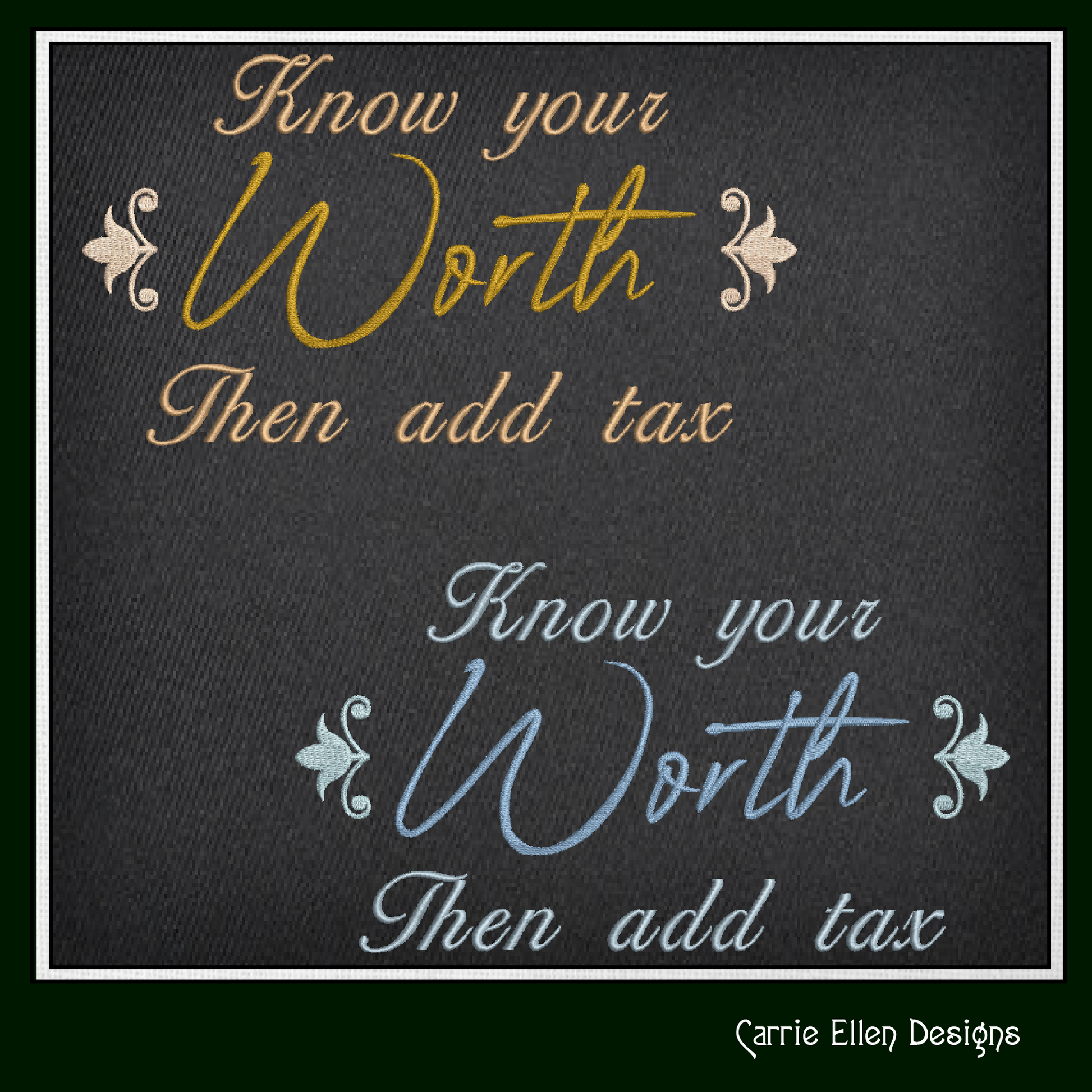 Know Your Worth Machine Embroidery Design Saying, Add Tax Snarky Funny Woman Empowerment Quote, 6 Sizes (2210)